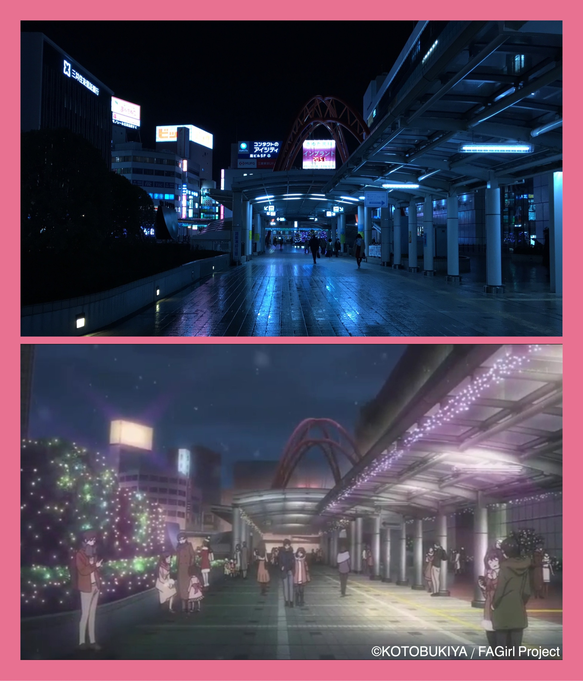 OP,第1話と同じ立ち位置よりペデストリアンデッキのモニュメント。若干ズームした構図です。
