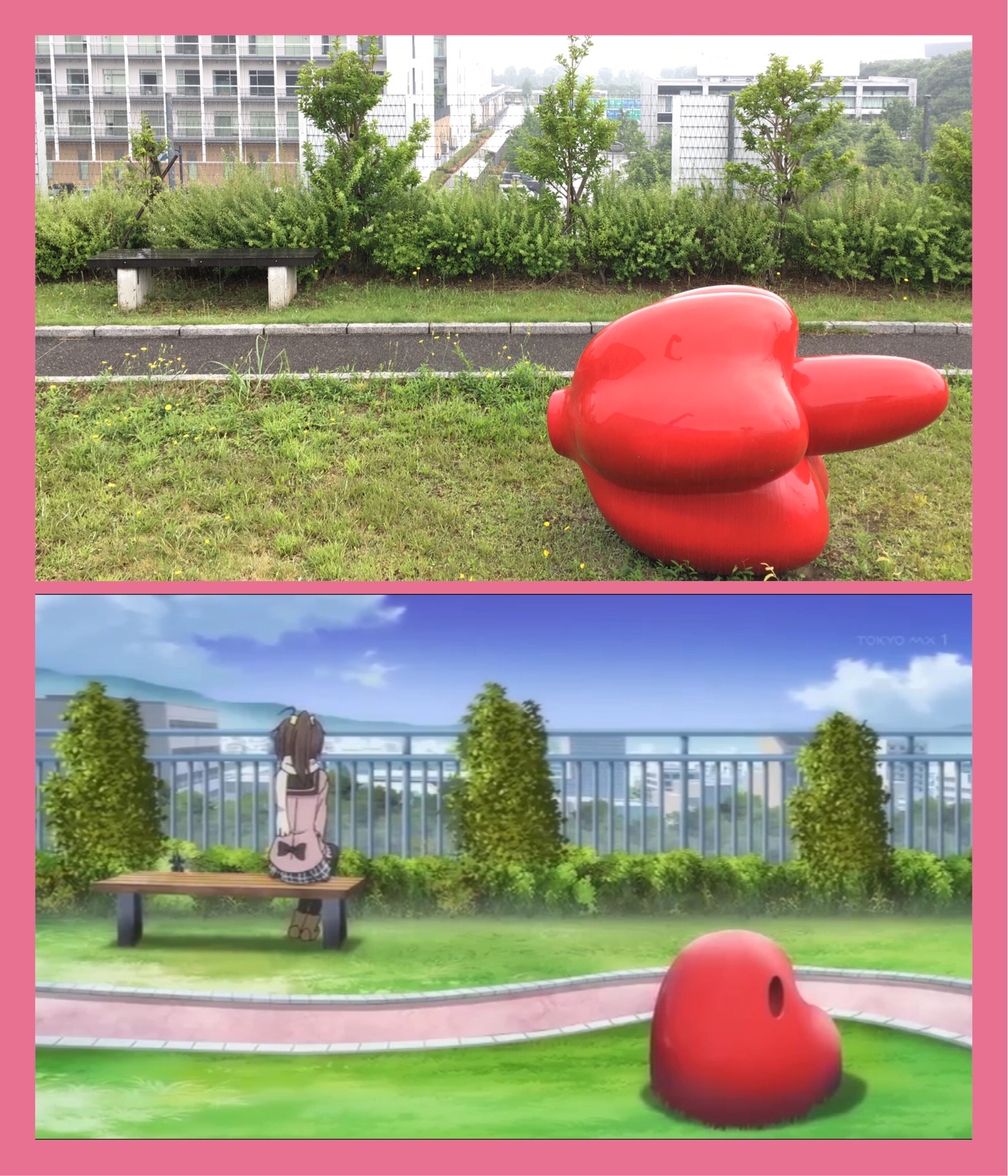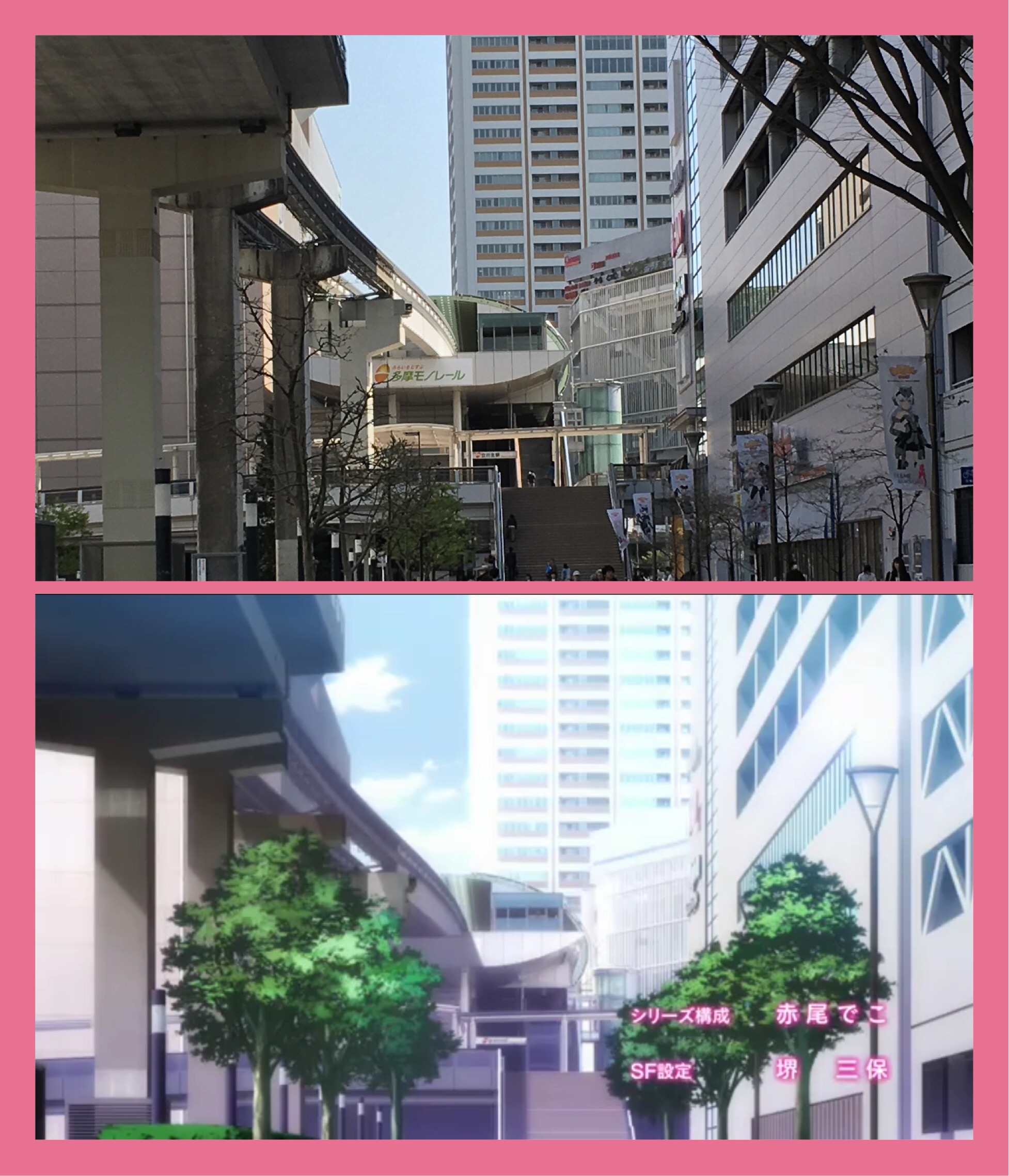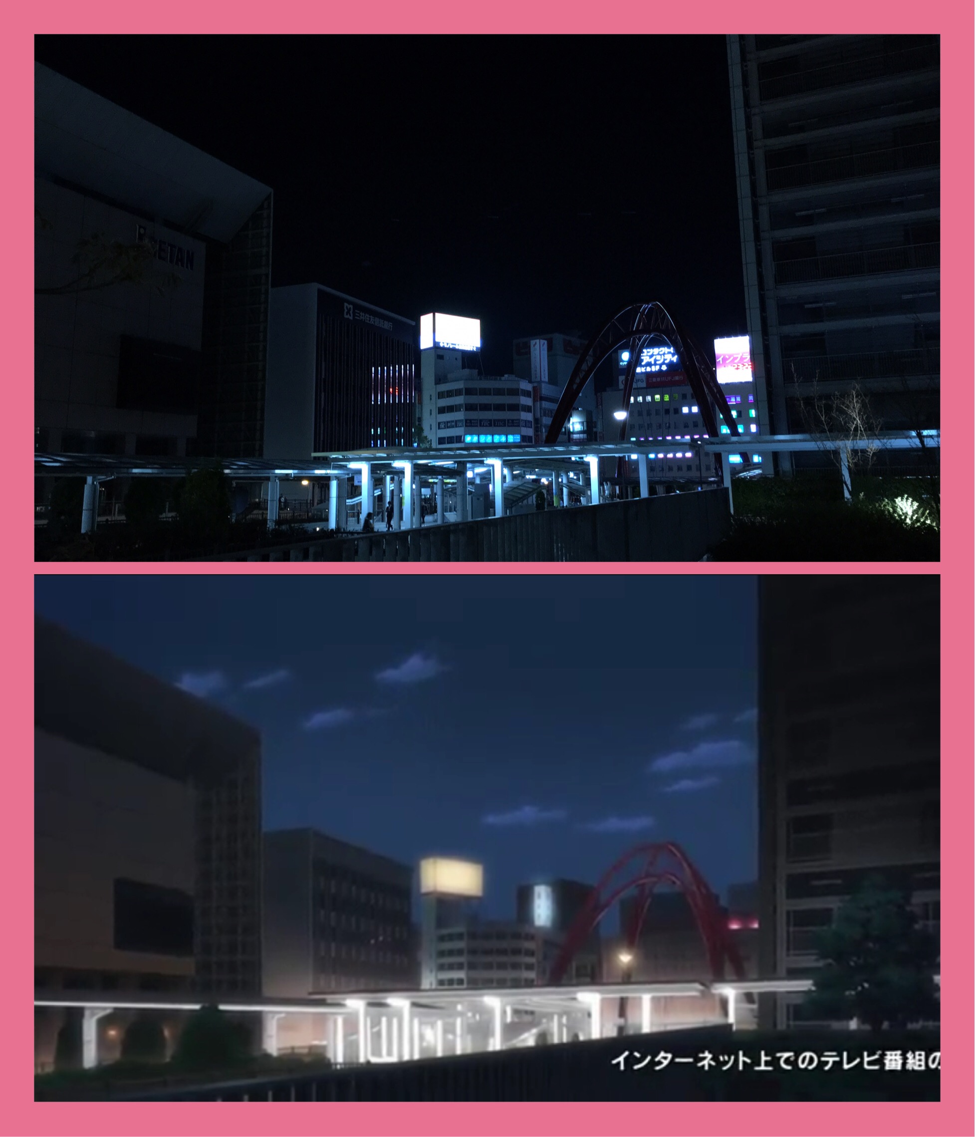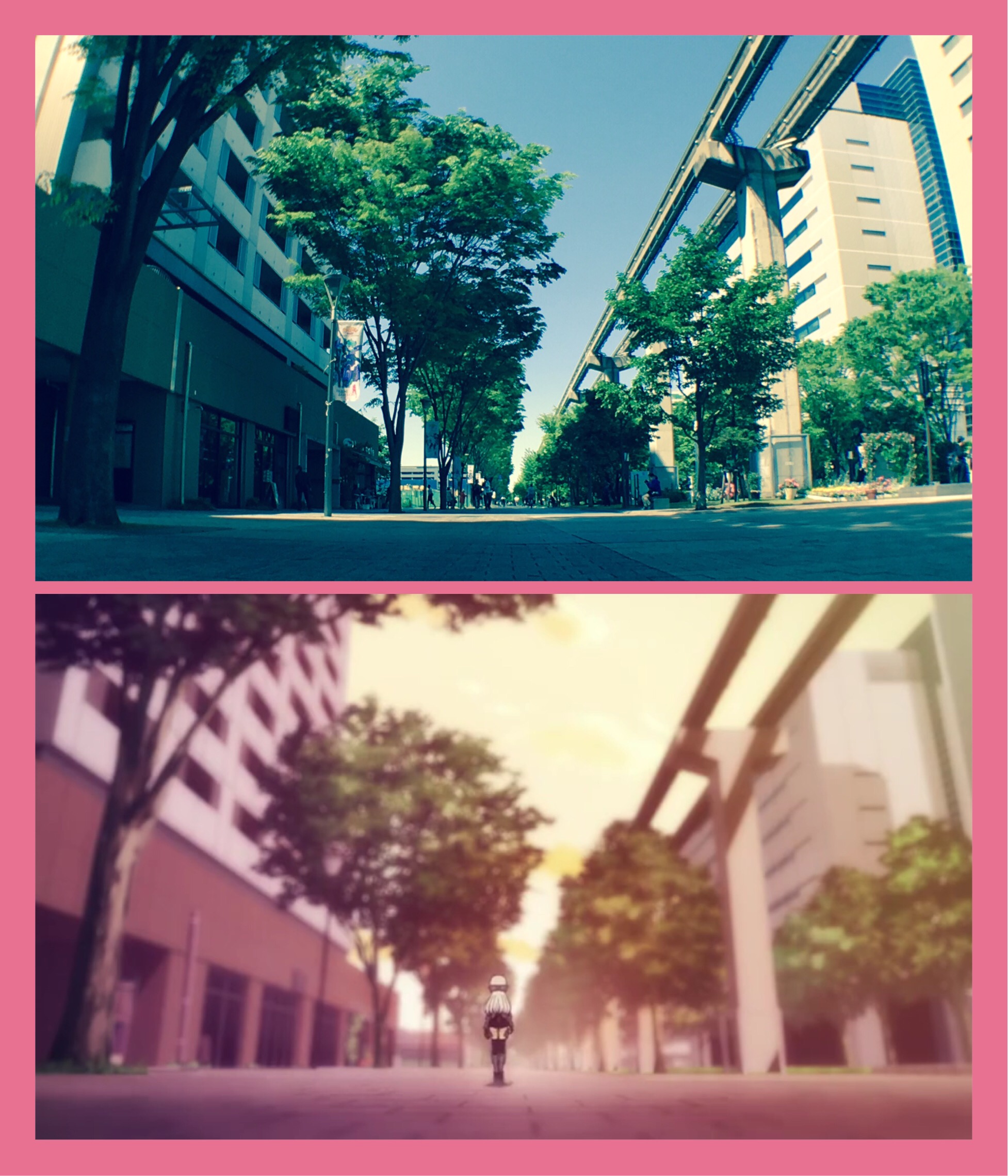 OP,第1話と同じ立ち位置よりペデストリアンデッキのモニュメント。若干ズームした構図です。