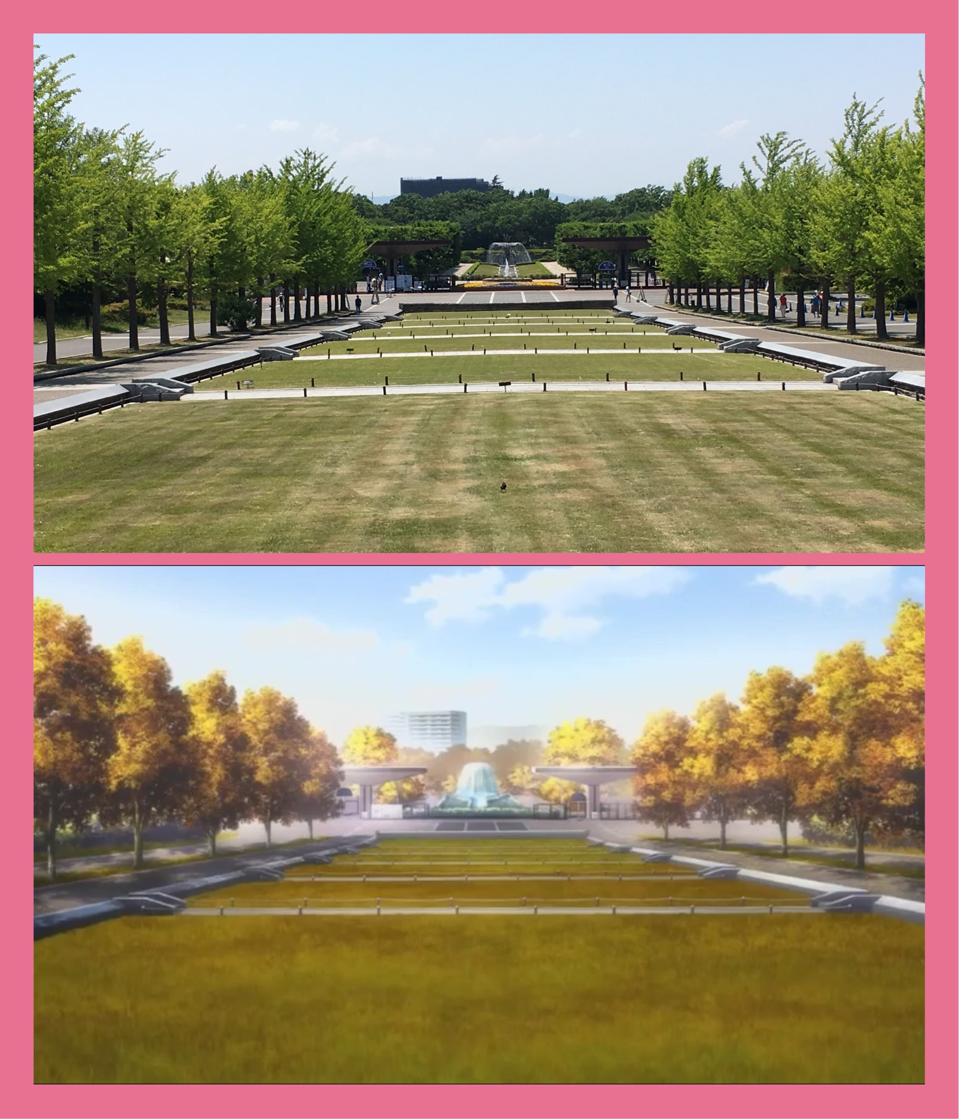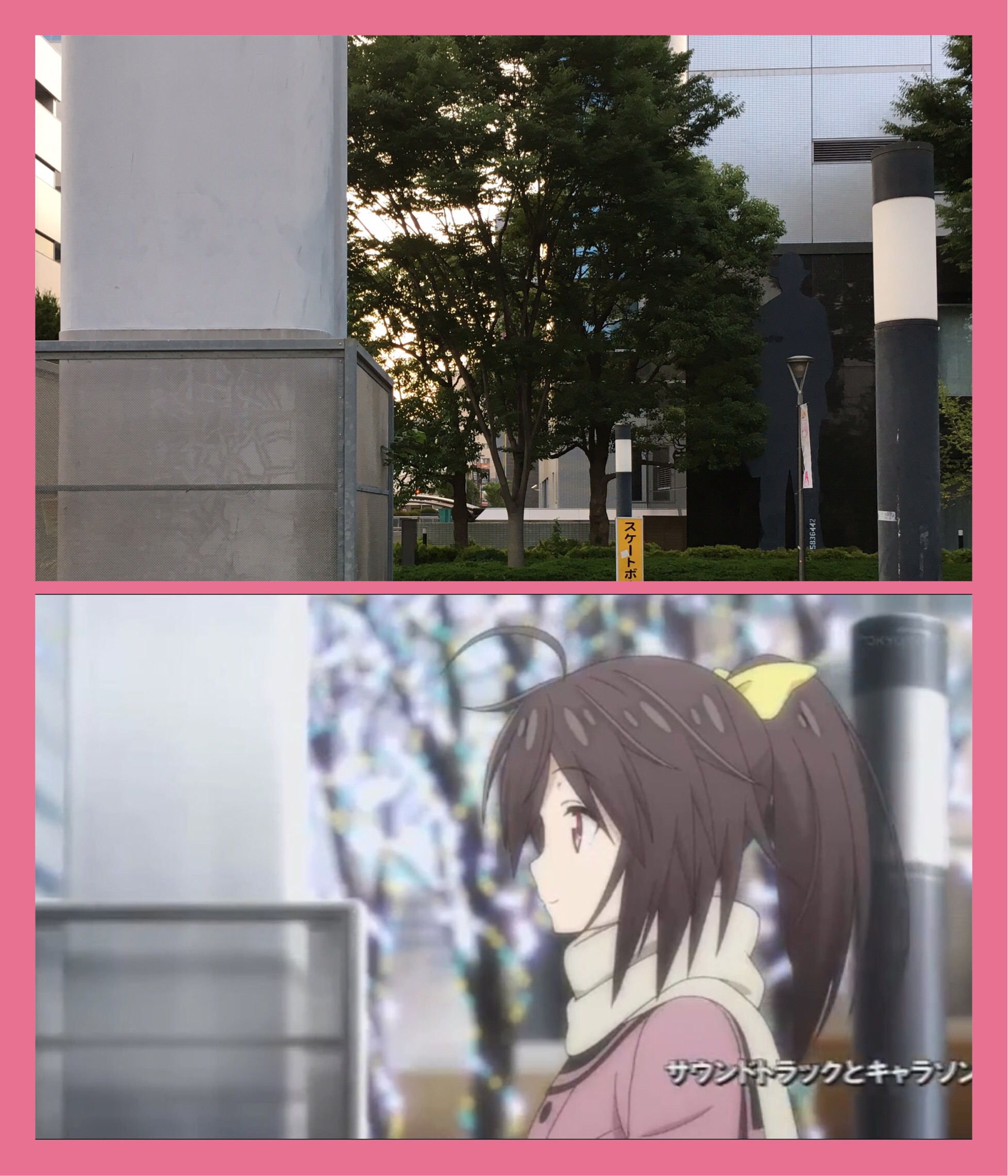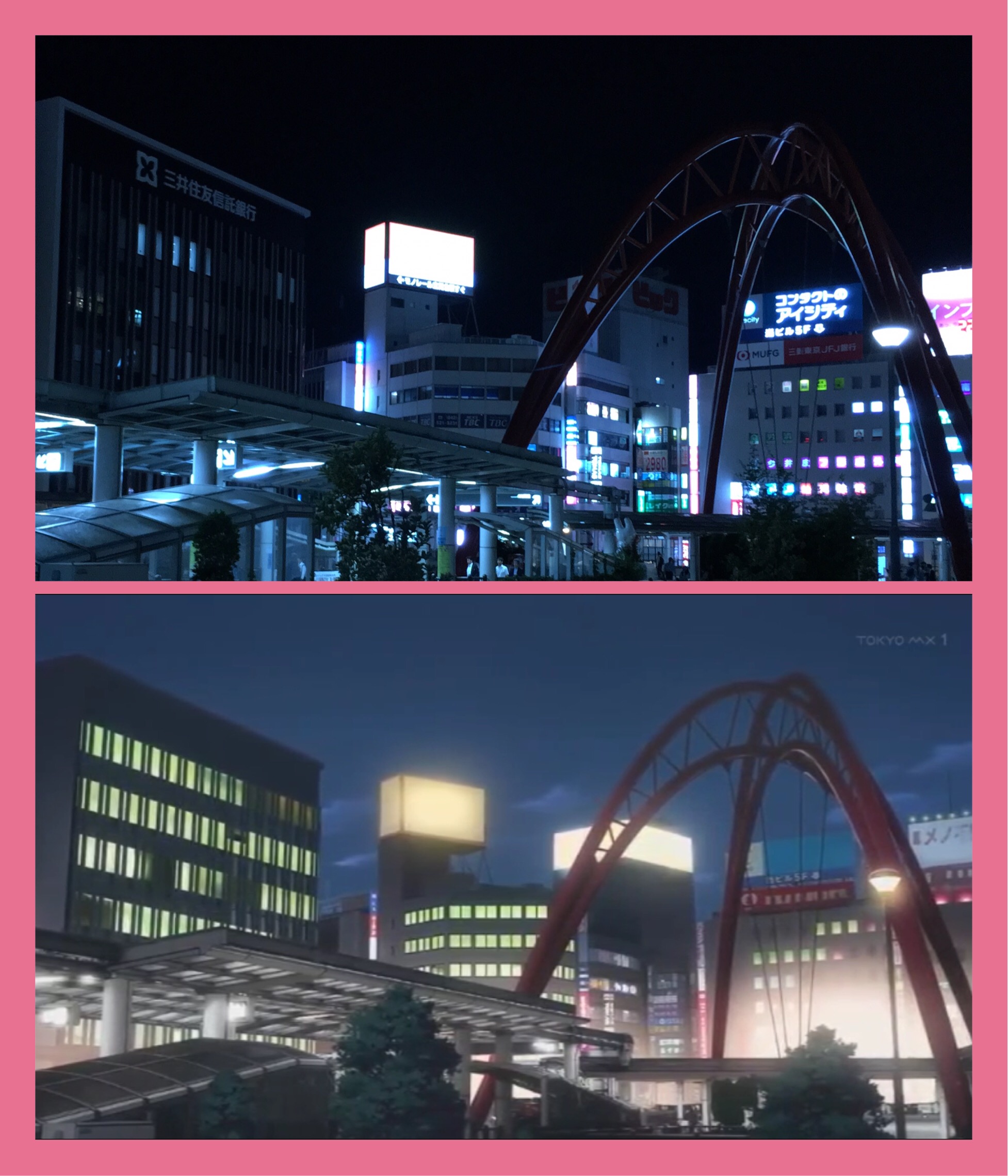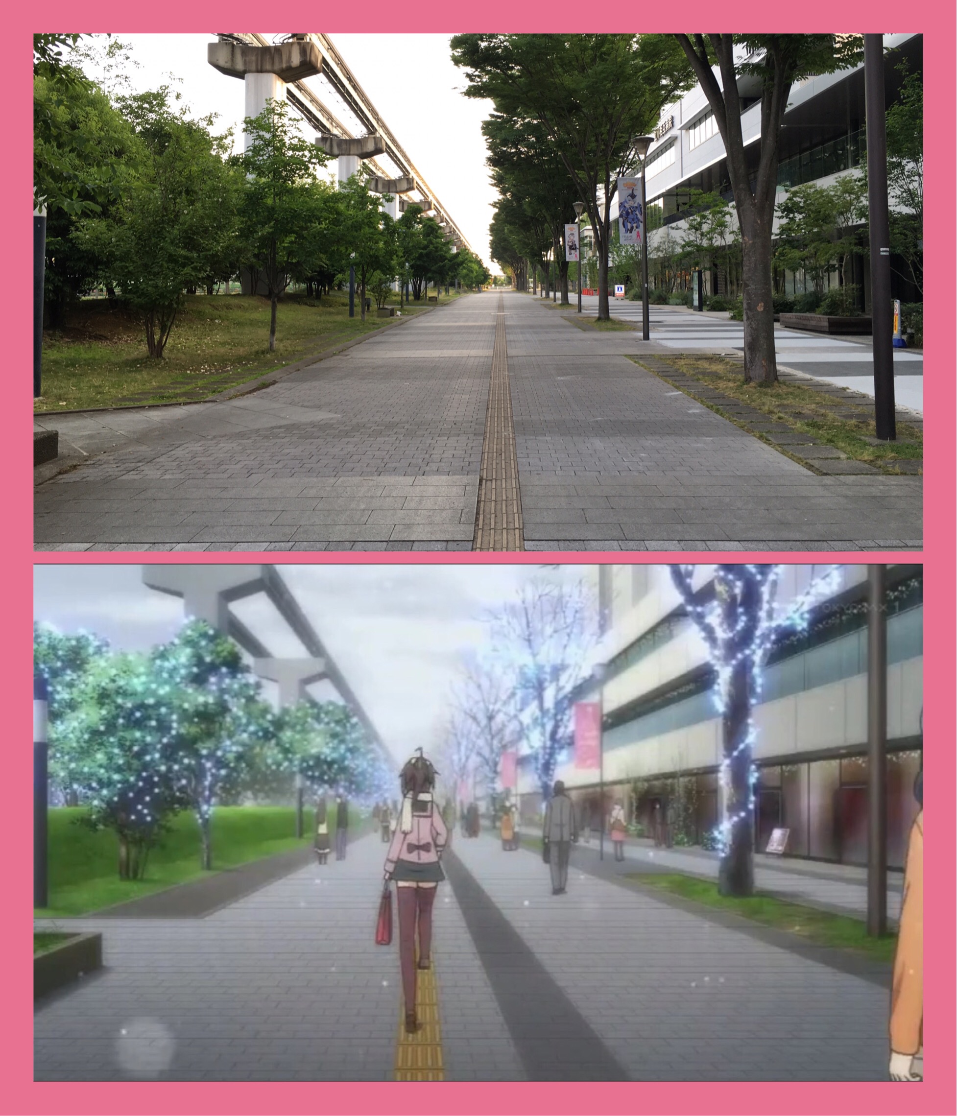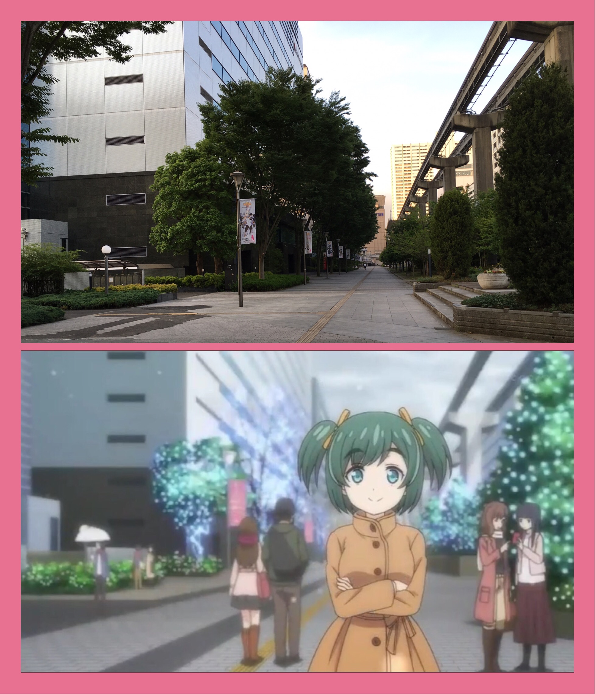 OP,第1話と同じ立ち位置よりペデストリアンデッキのモニュメント。若干ズームした構図です。