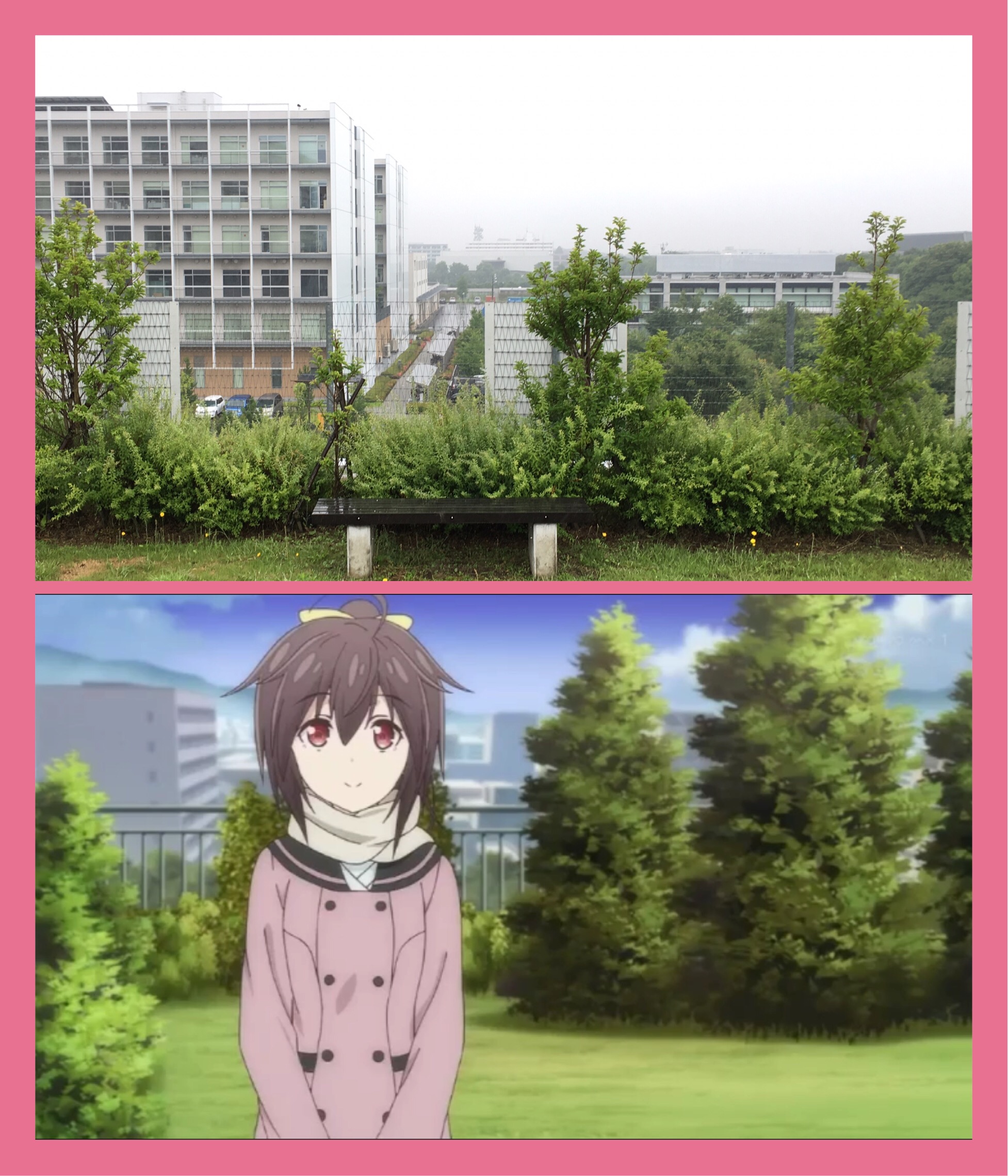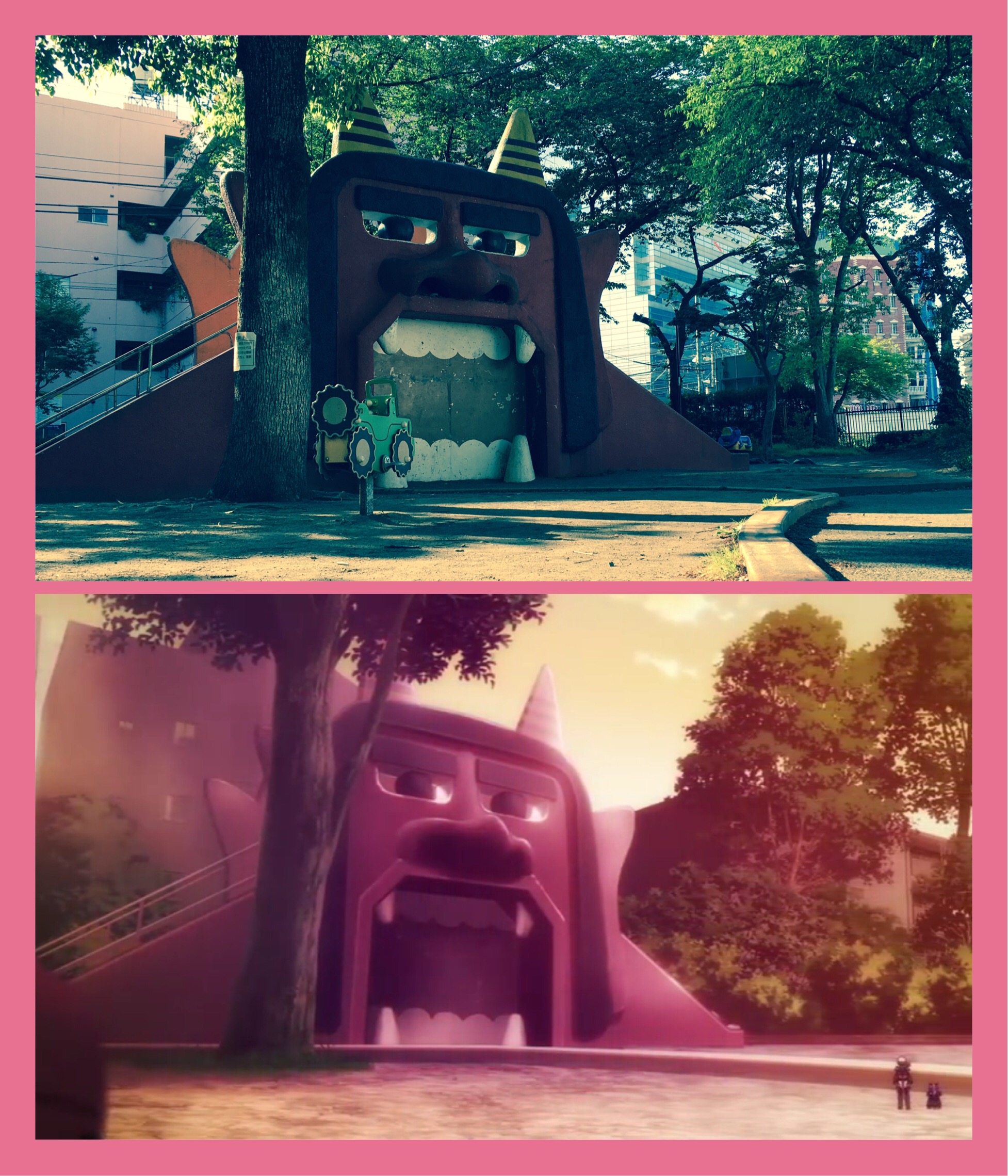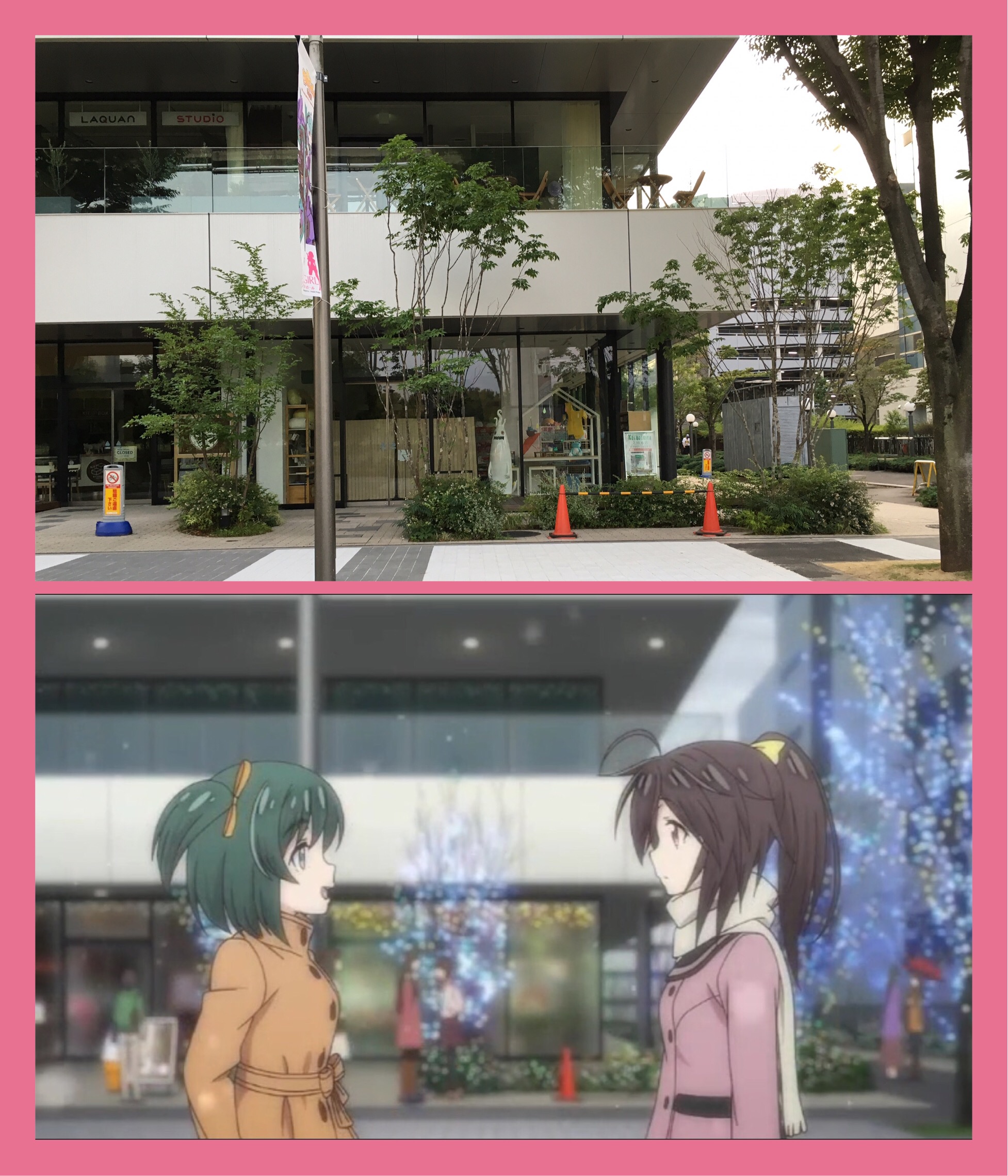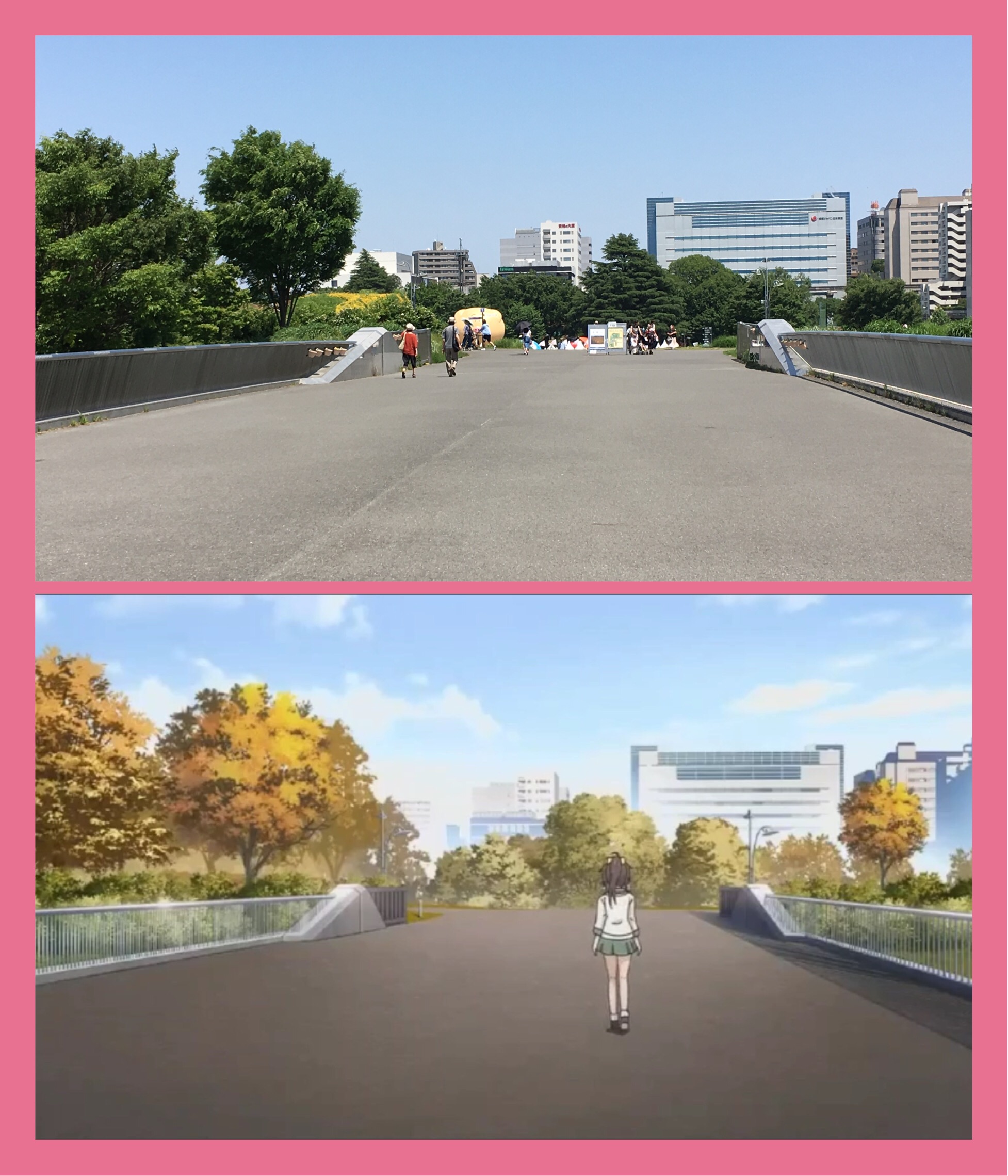 OP,第1話と同じ立ち位置よりペデストリアンデッキのモニュメント。若干ズームした構図です。