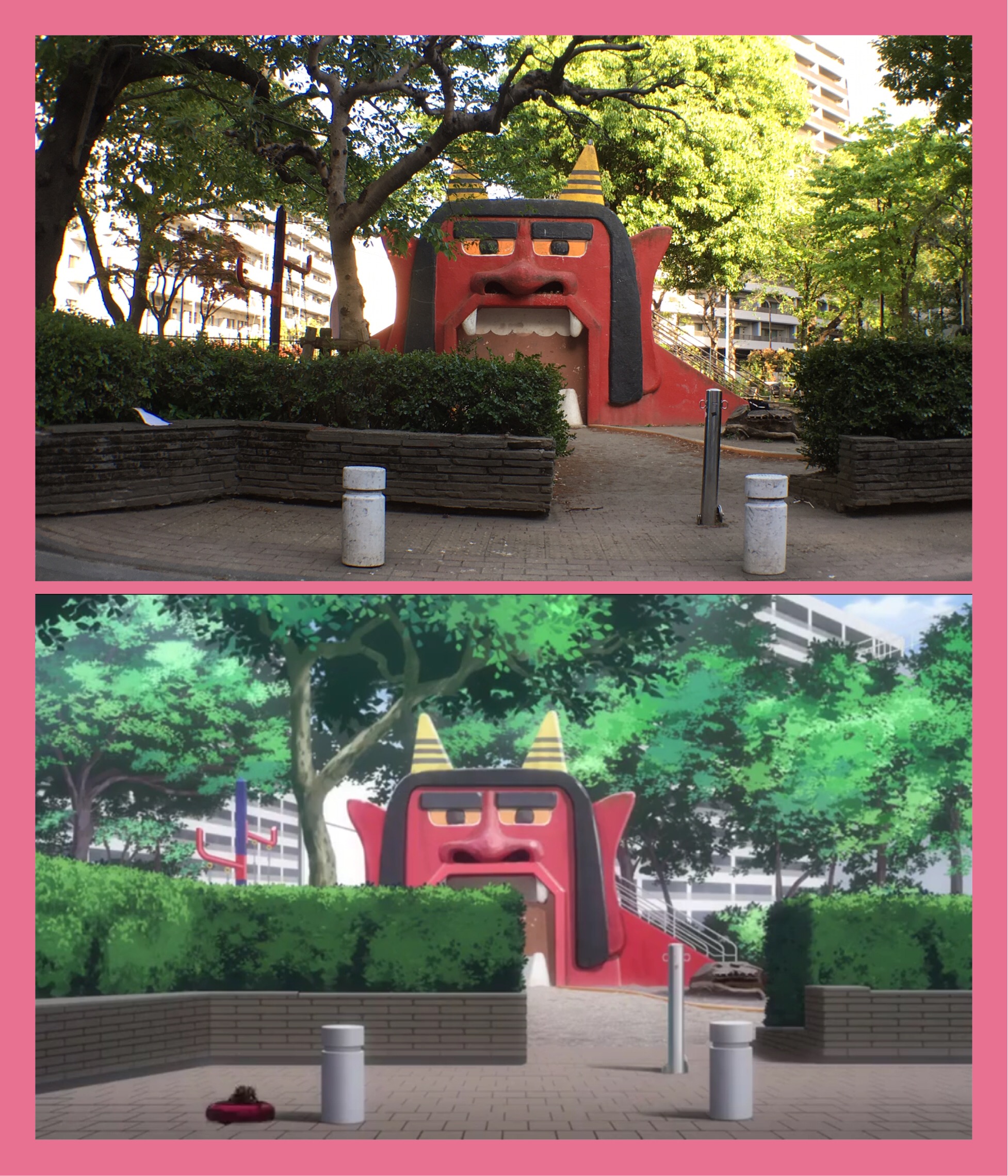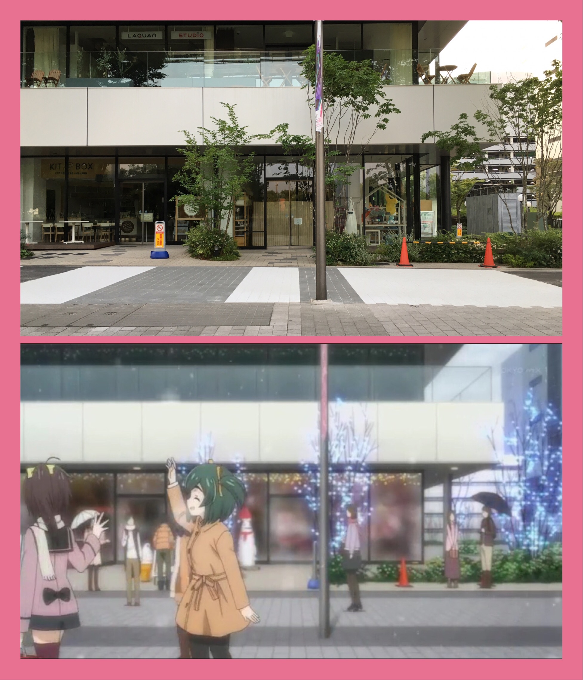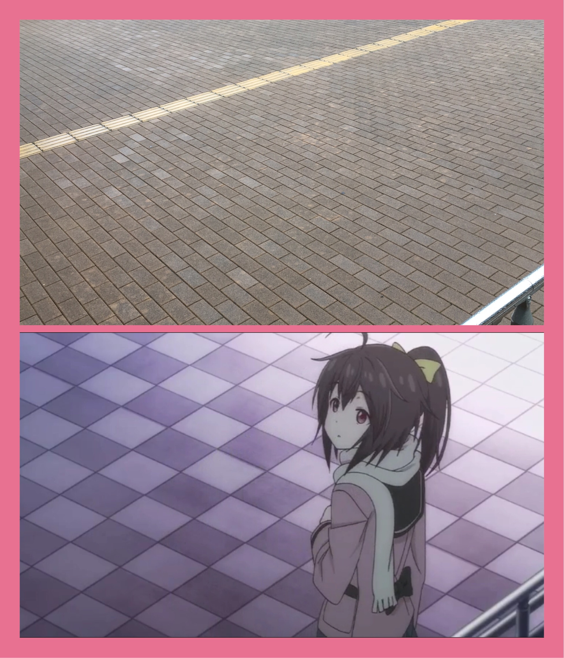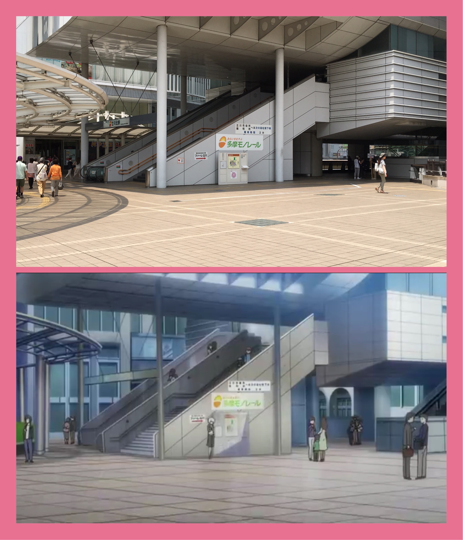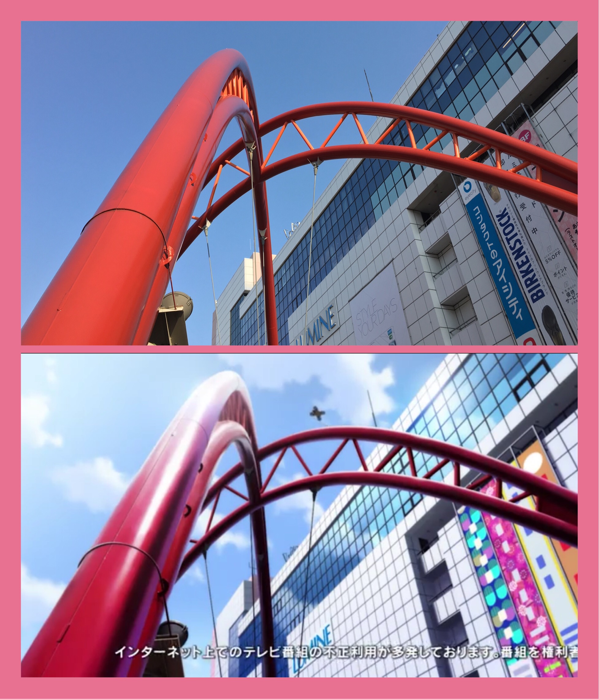 OP,第1話と同じ立ち位置よりペデストリアンデッキのモニュメント。若干ズームした構図です。