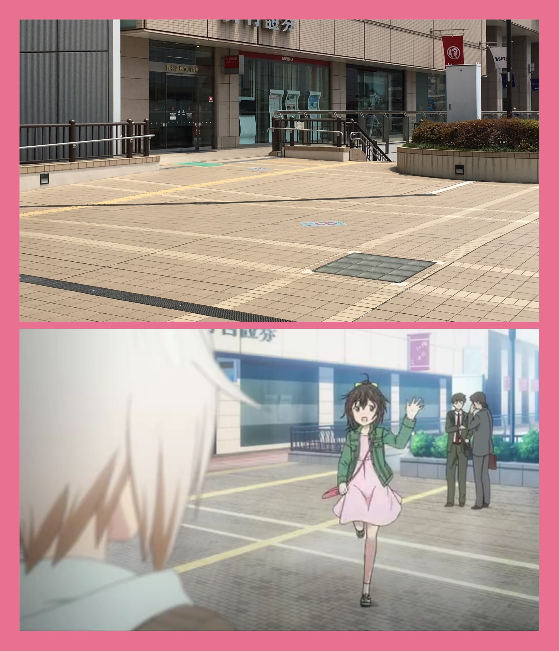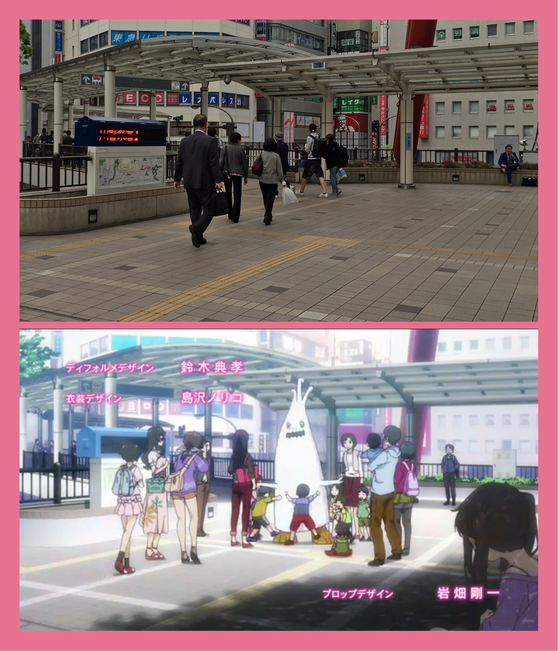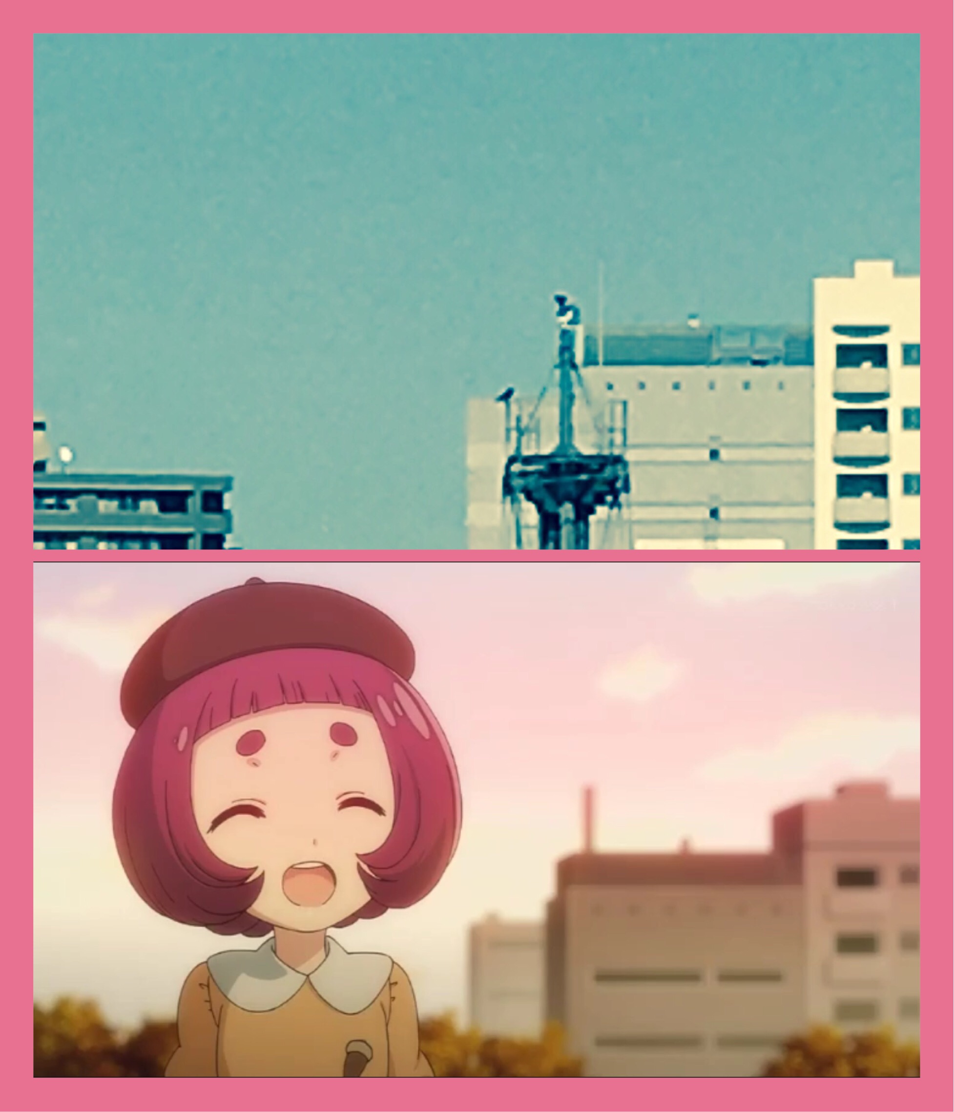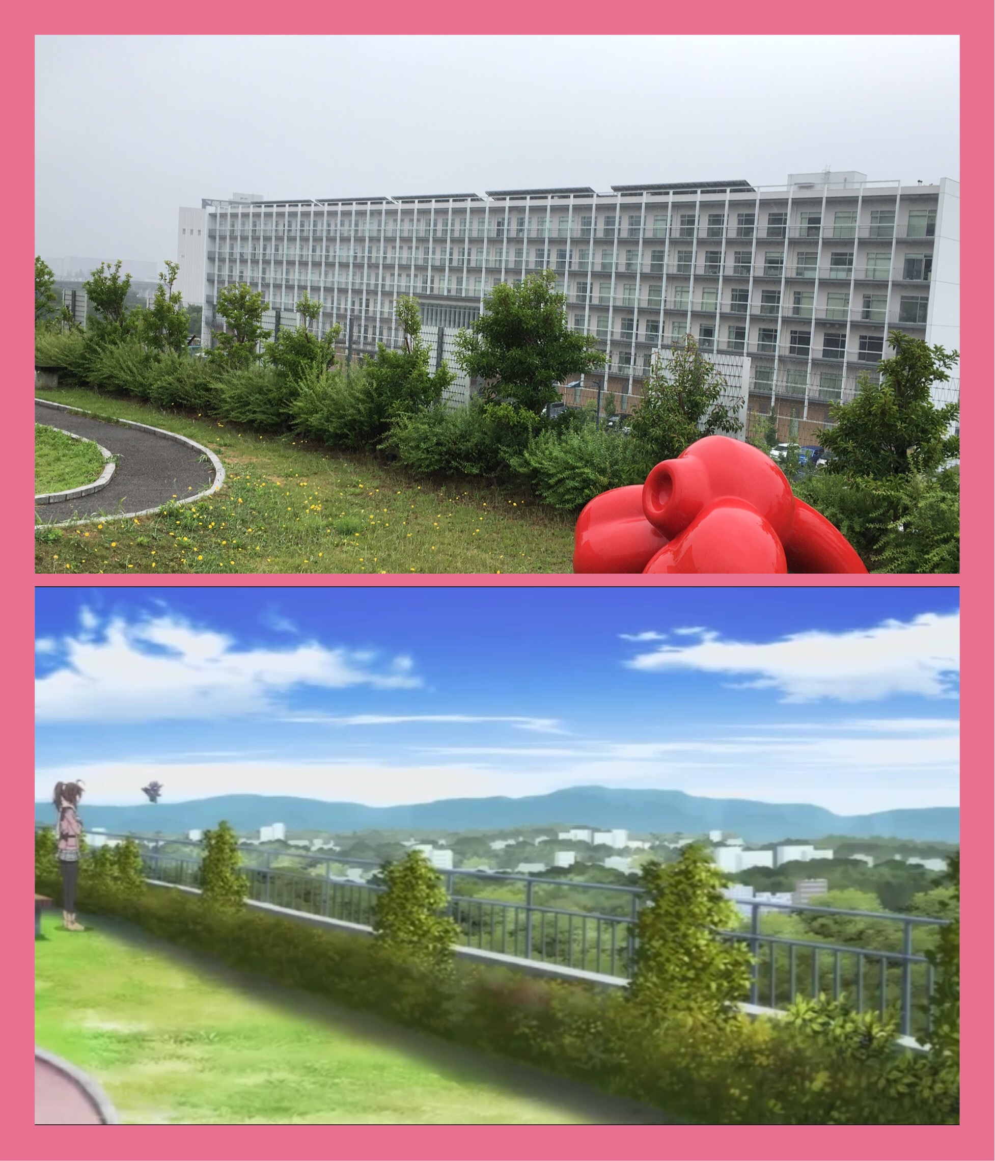 OP,第1話と同じ立ち位置よりペデストリアンデッキのモニュメント。若干ズームした構図です。