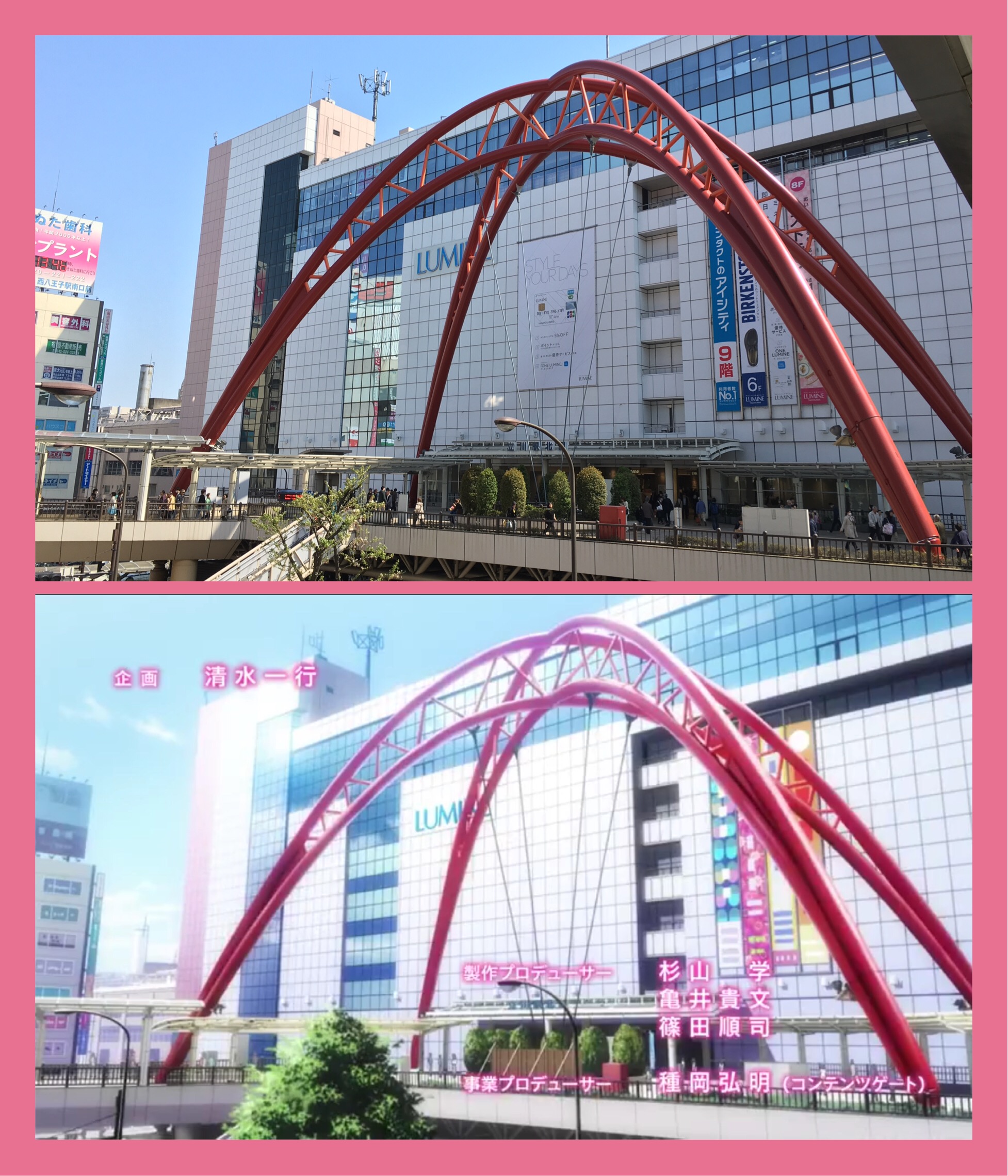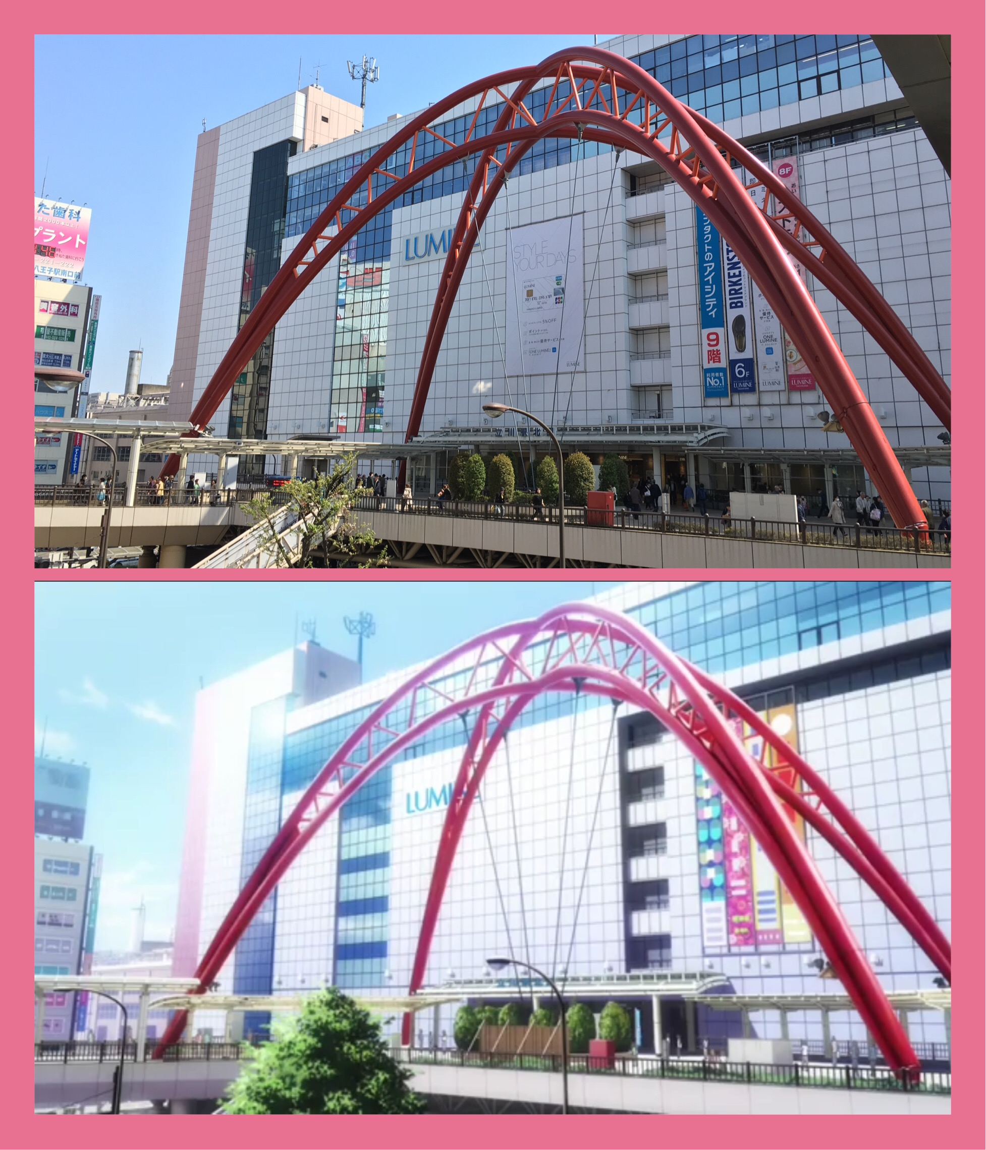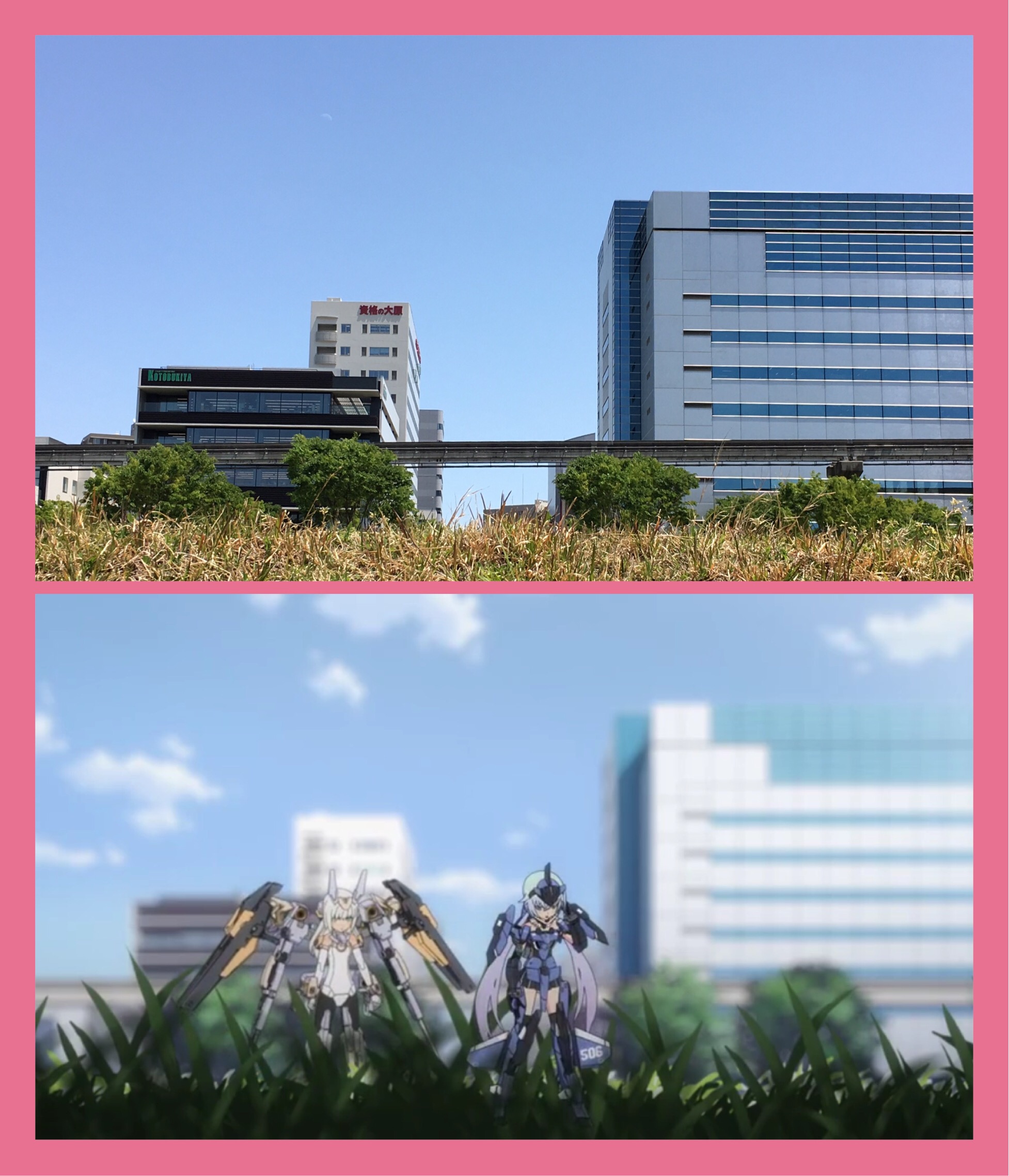 最初の最初に登場するのが商業地区として名高い立川市の立川駅北側ペデストリアンデッキ&巨大なアーチのモニュメント。今作の著作元であるコトブキヤ様本社は立川駅の近くに在ります。