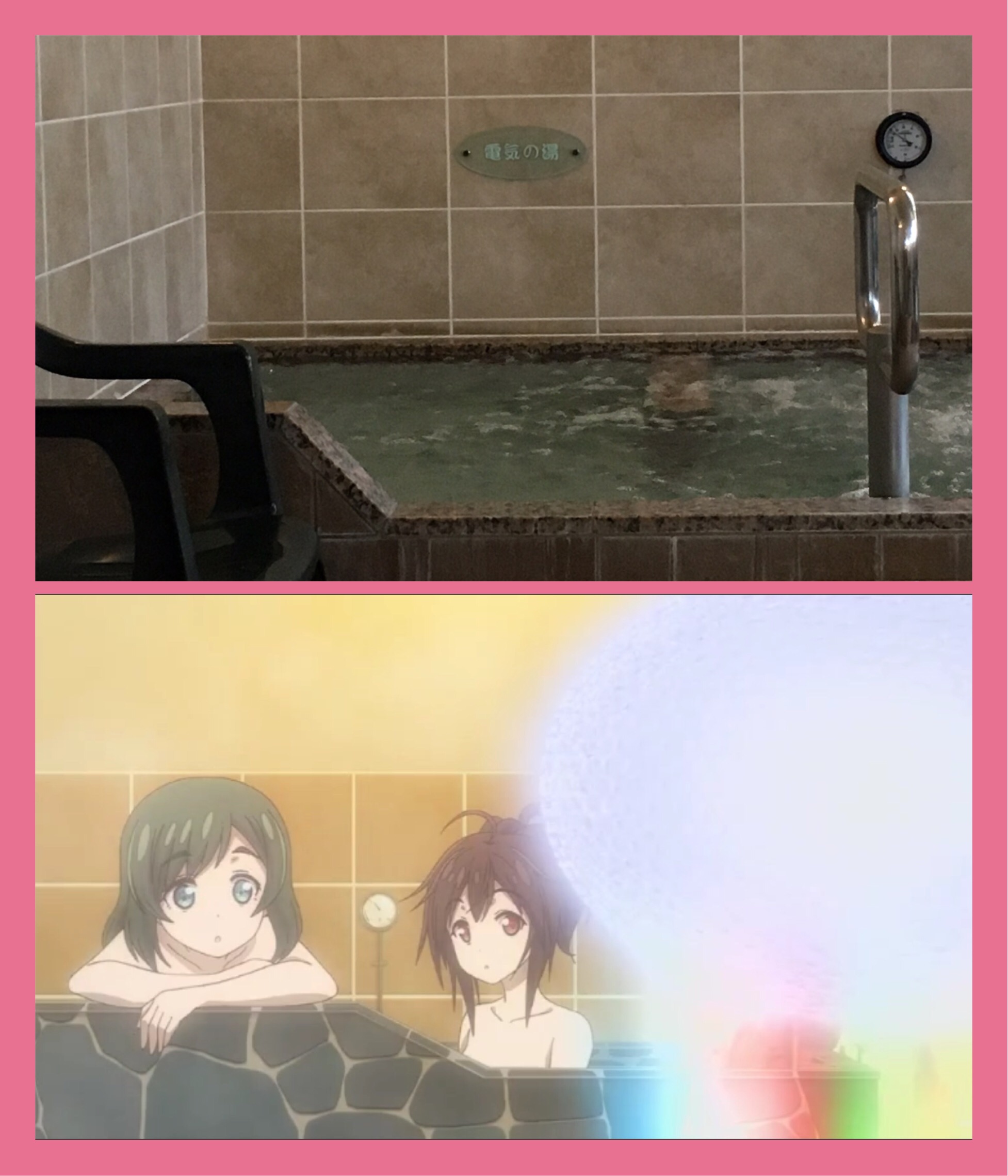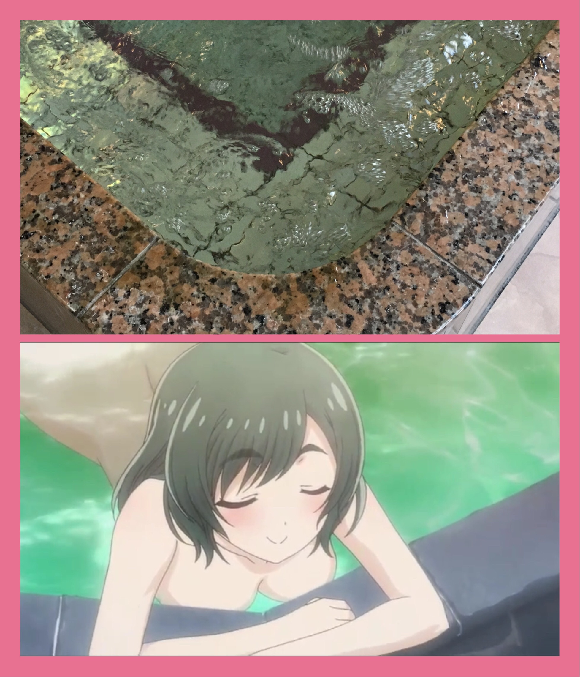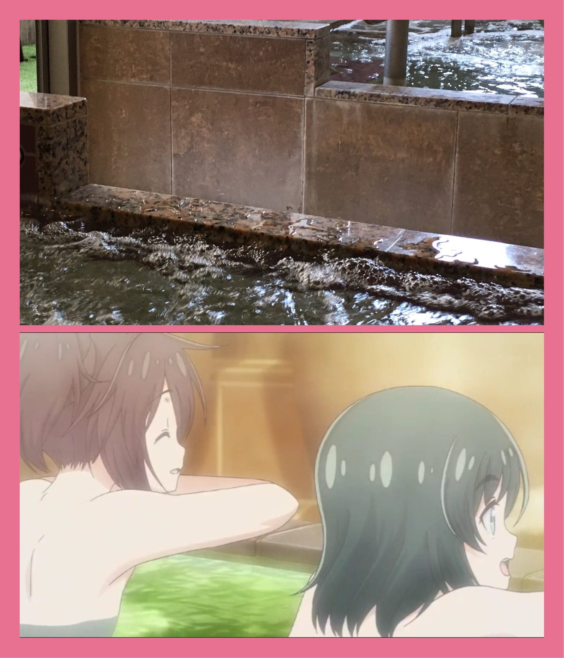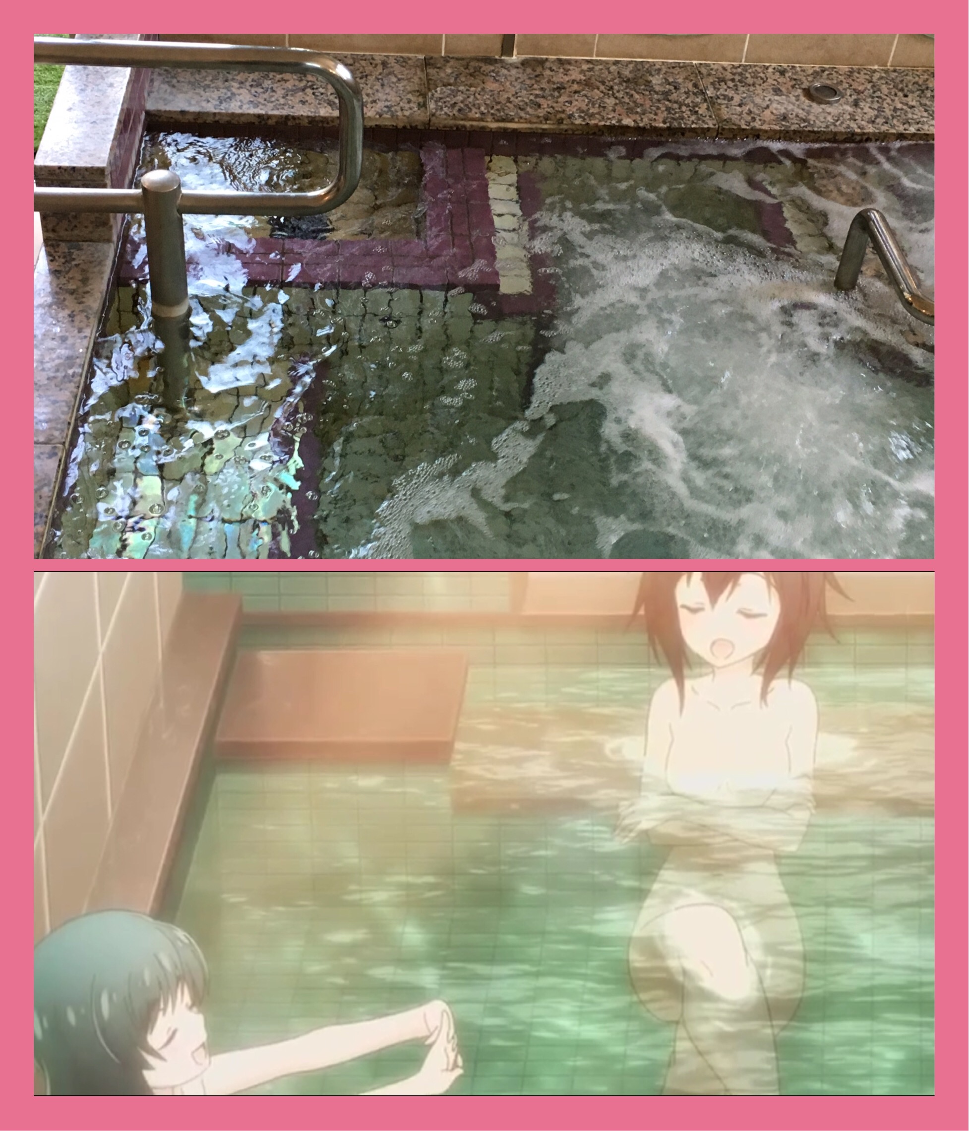 男女1F2Fを週替わりで営業されている様です。今週はアニメ通りの女性1F。つまり男である私はあおちゃん達と同じ浴槽に入ることは出来ませんでした(´∀`=)残念…またいつか。しかし、休憩室のシーンののれんはアニメ通りなのでバッチリでした。