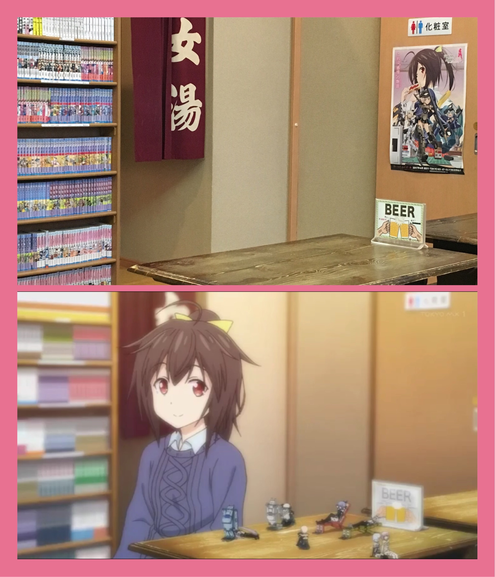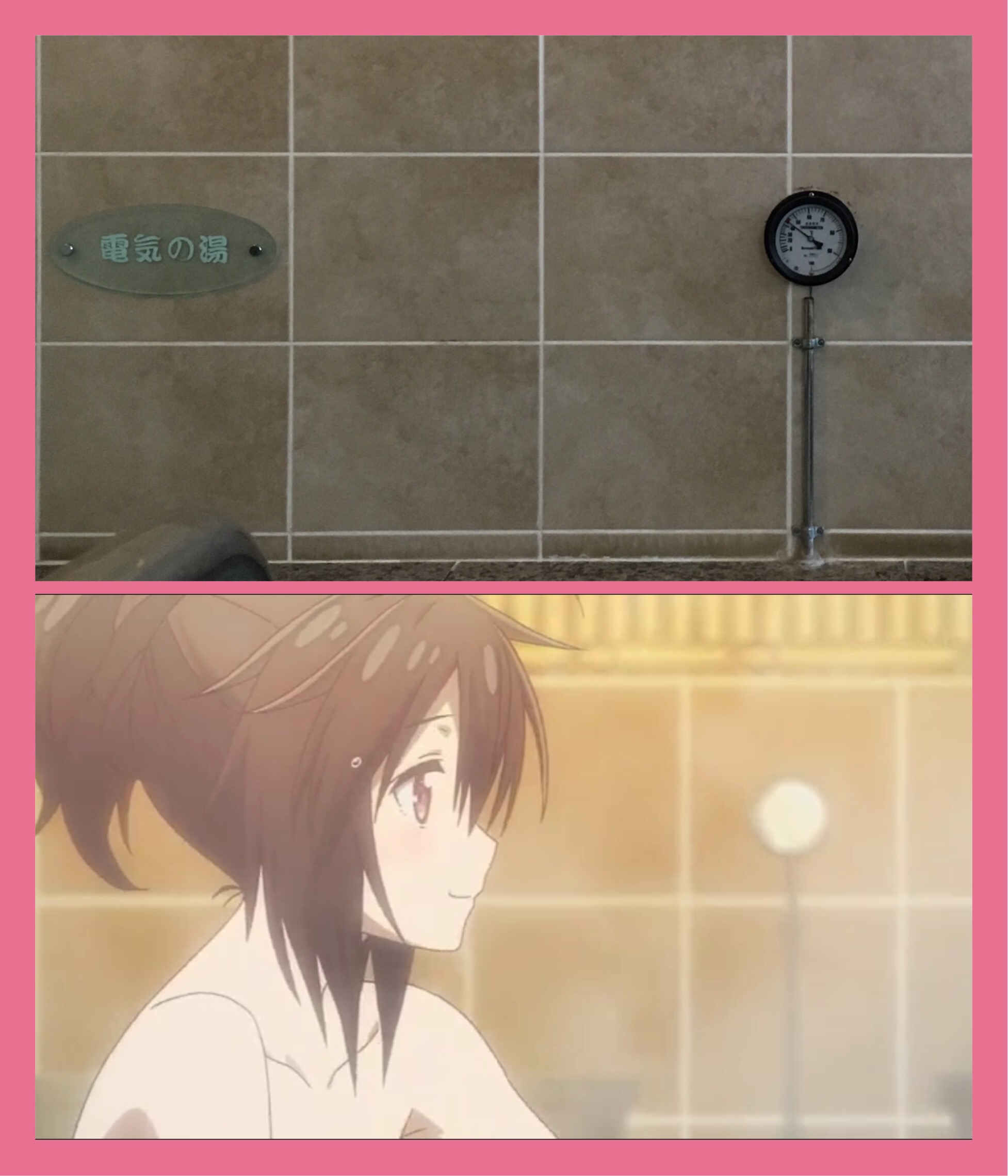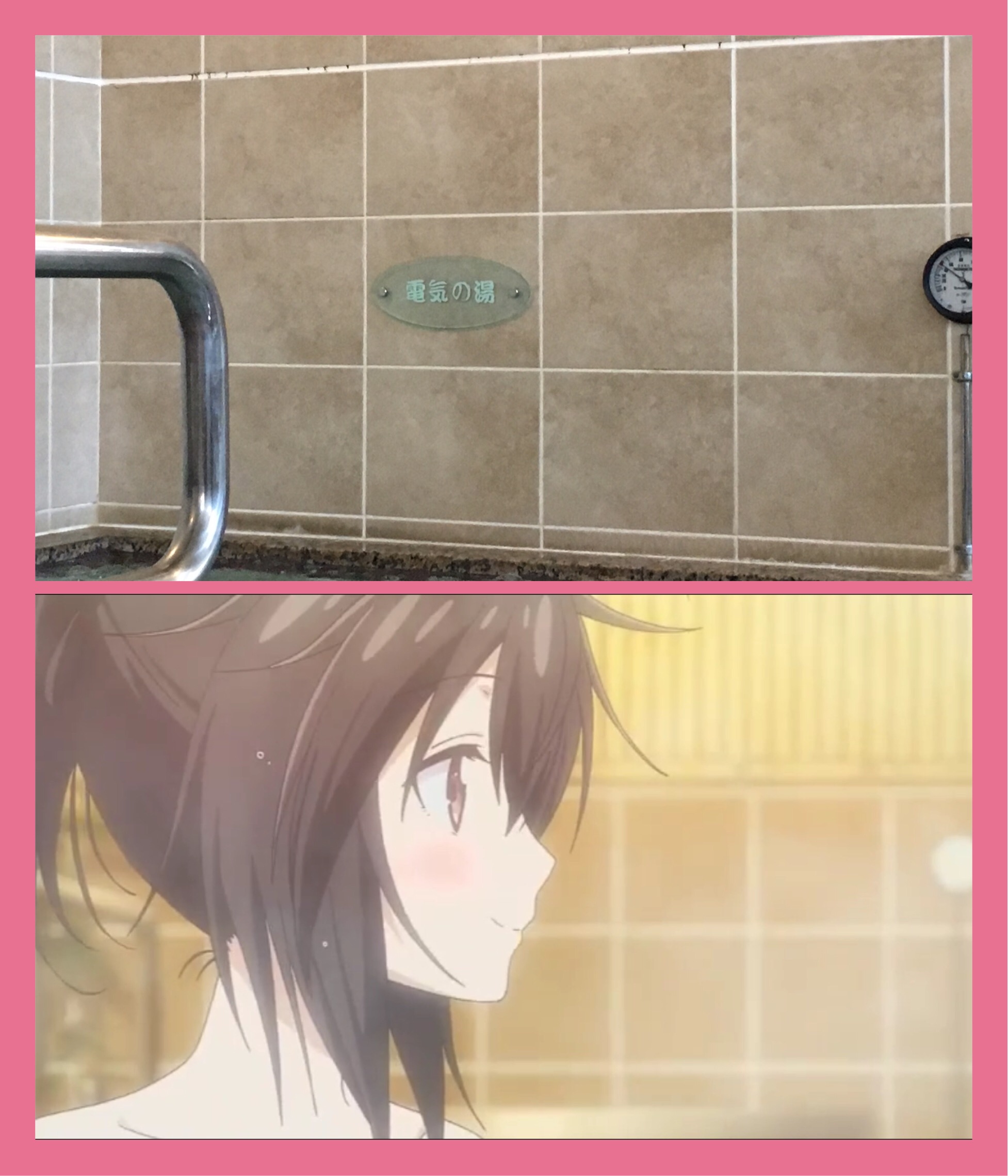 男女1F2Fを週替わりで営業されている様です。今週はアニメ通りの女性1F。つまり男である私はあおちゃん達と同じ浴槽に入ることは出来ませんでした(´∀`=)残念…またいつか。しかし、休憩室のシーンののれんはアニメ通りなのでバッチリでした。