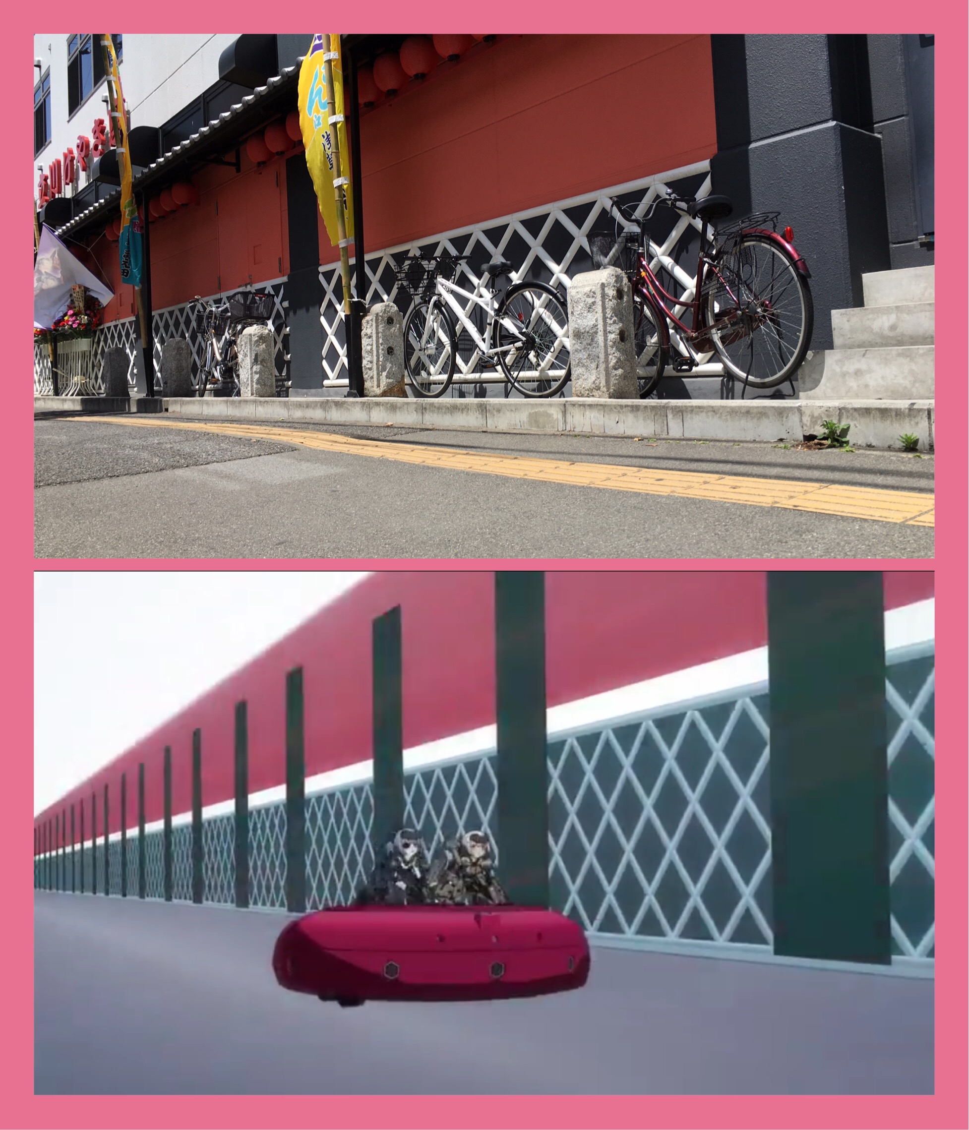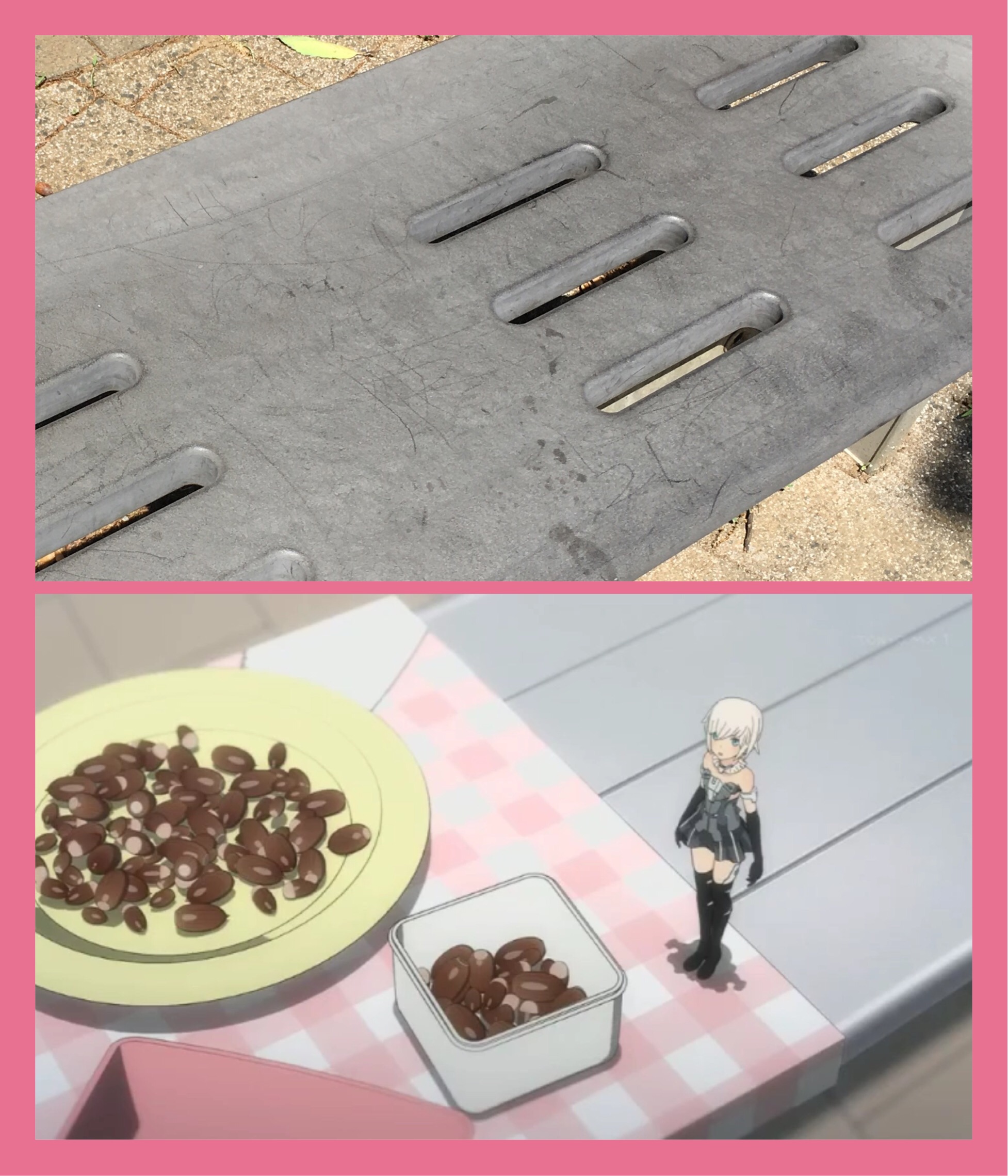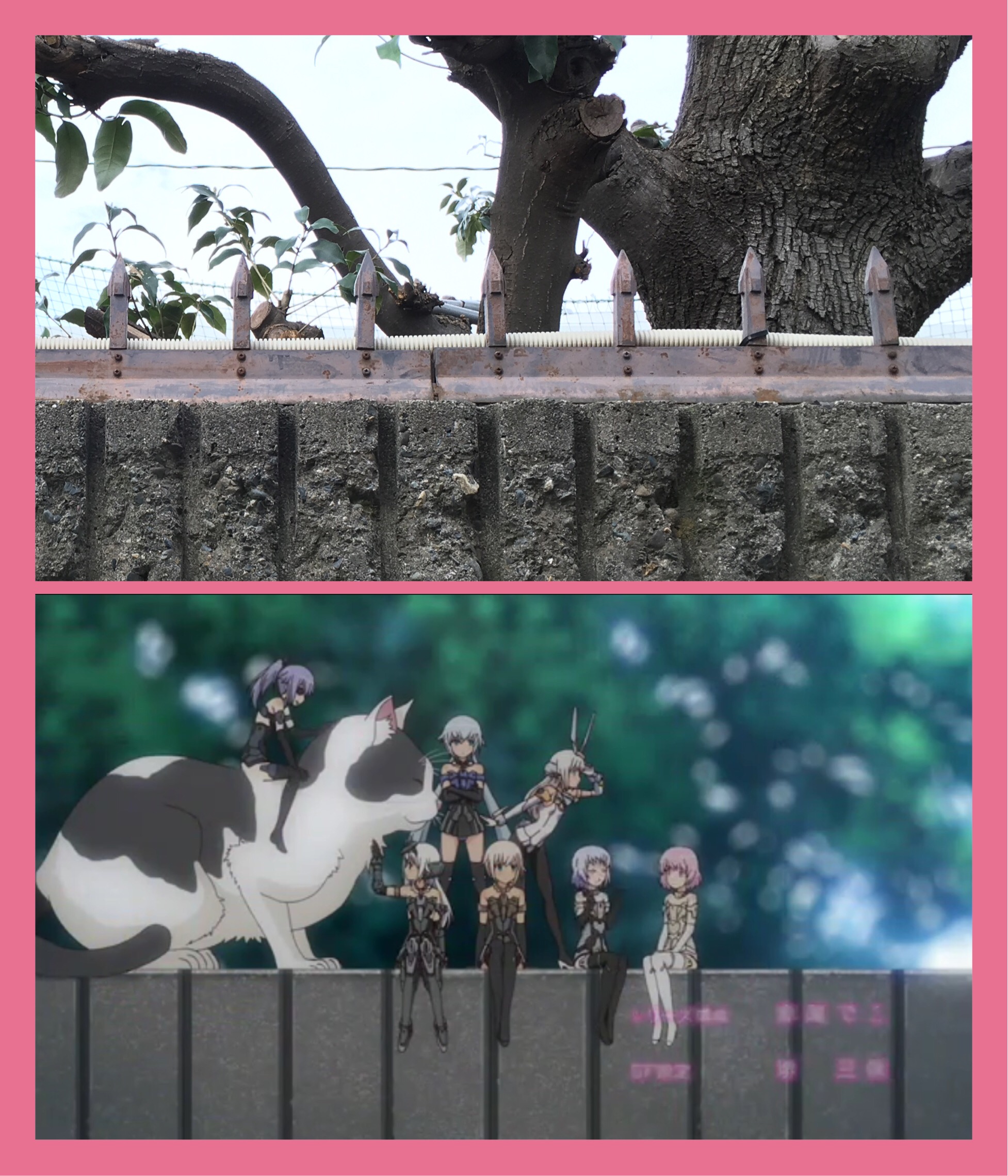 ガール達が乗っている塀。実際はトゲトゲがありますね。