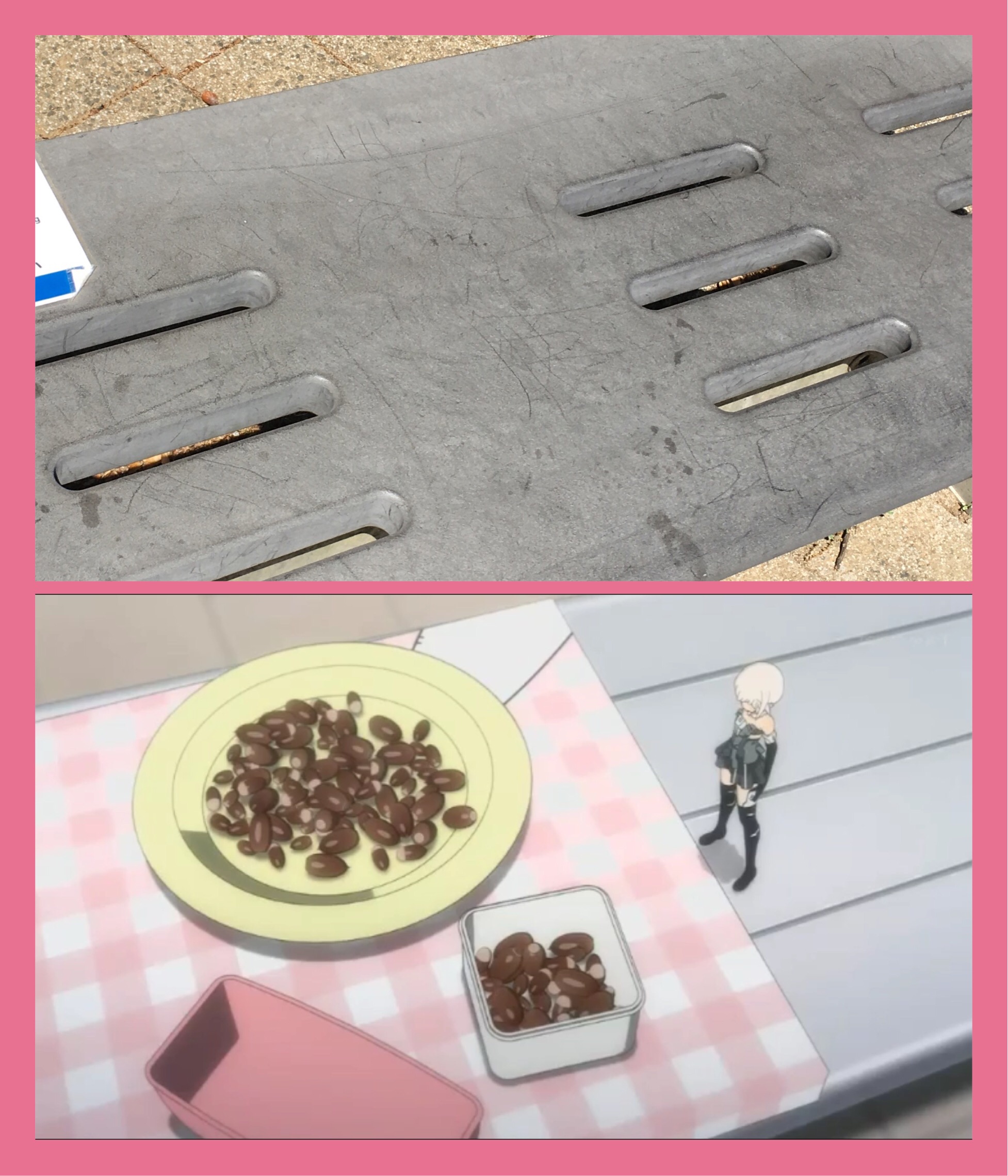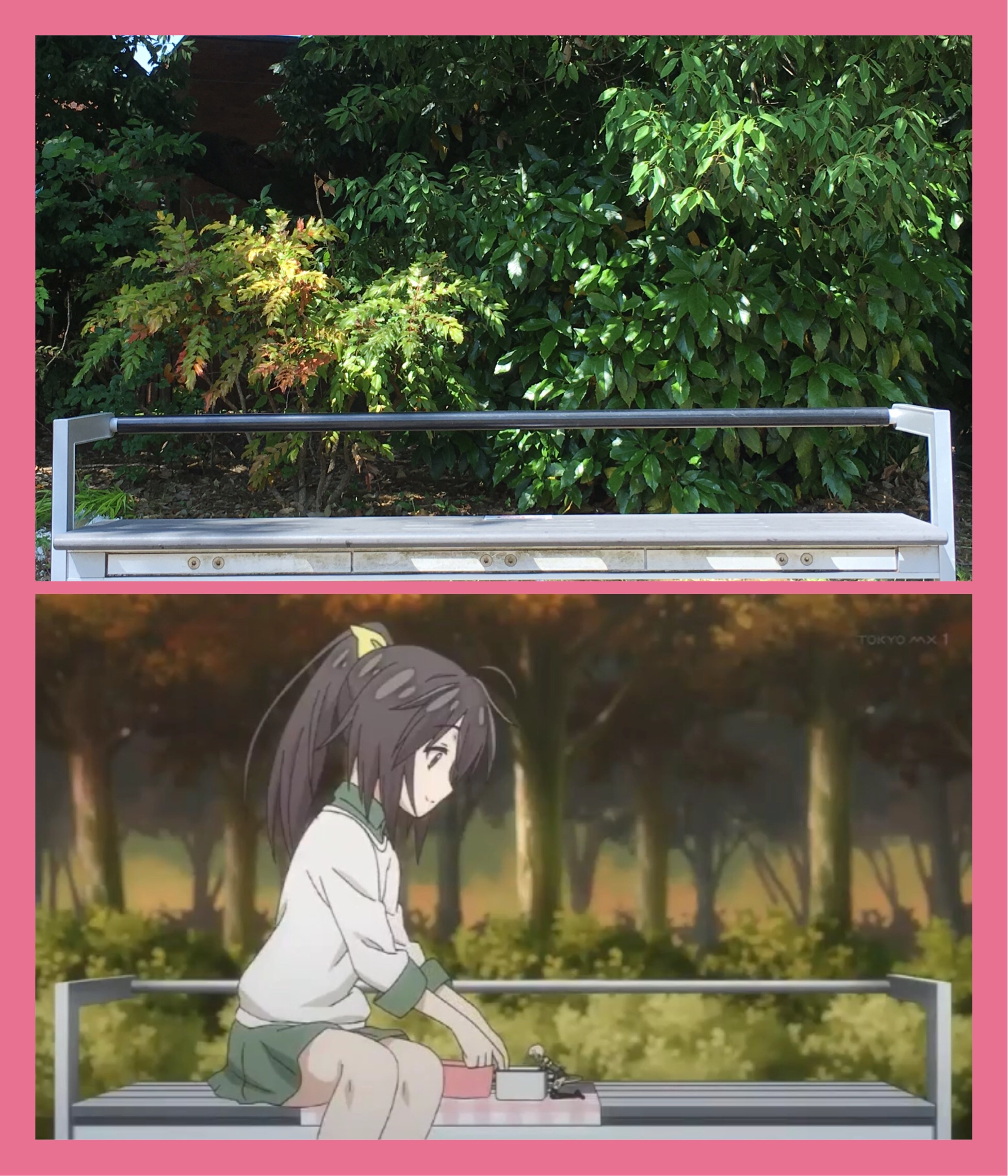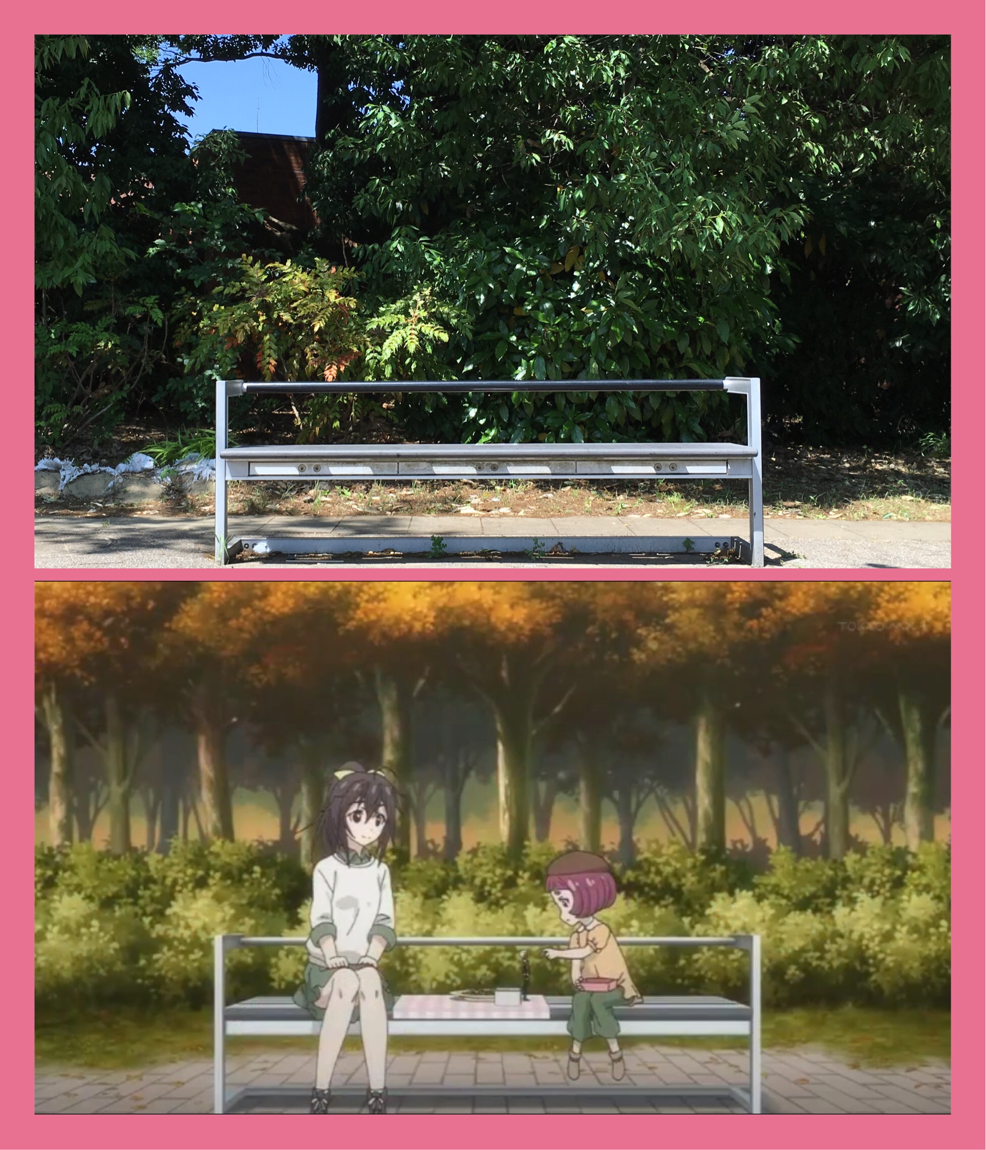 昭和記念公園あけぼの口近くにある総合案内所横のベンチです。作中にも描かれている骨型の置物は「リードつなぎ」です。