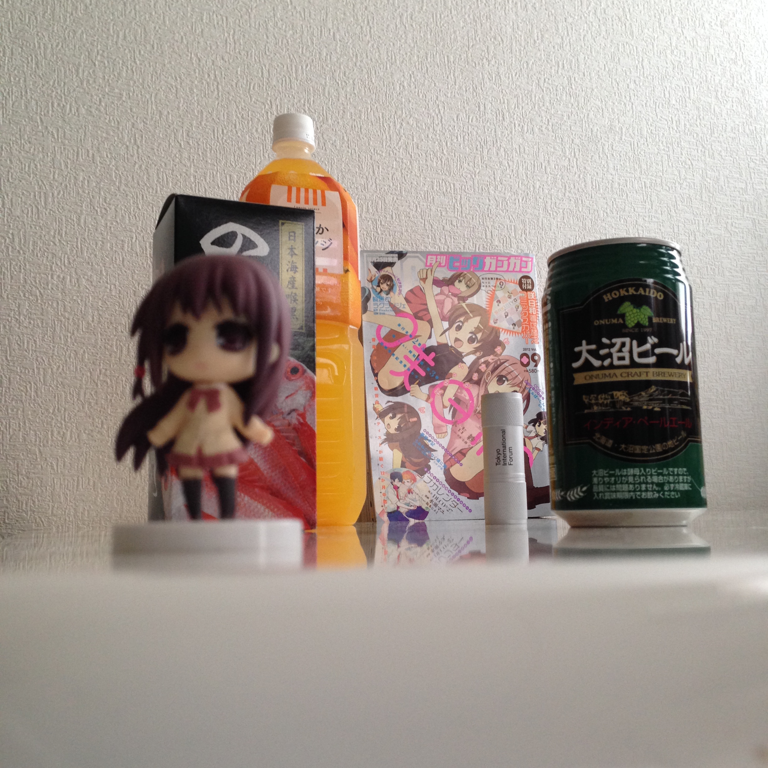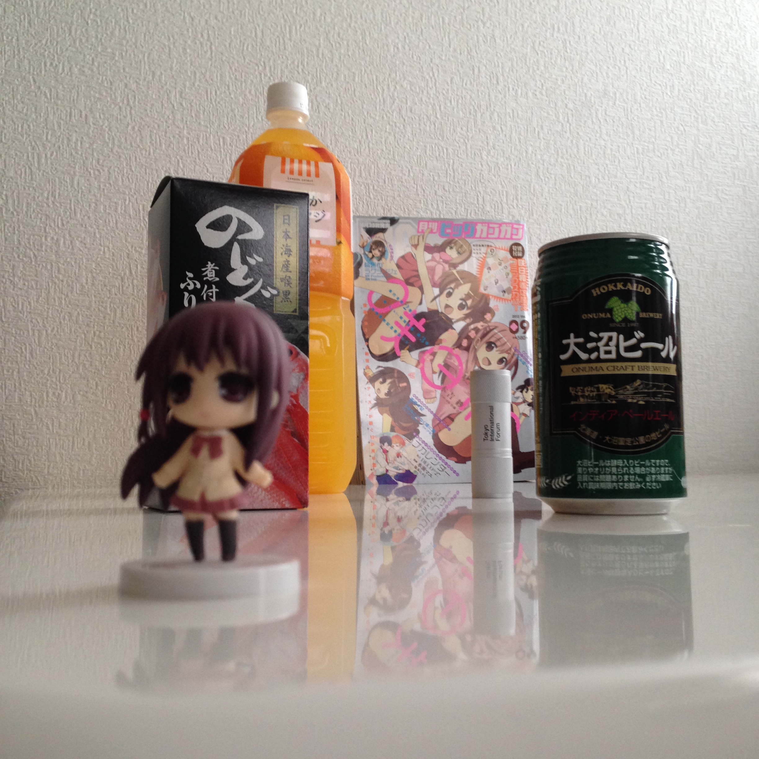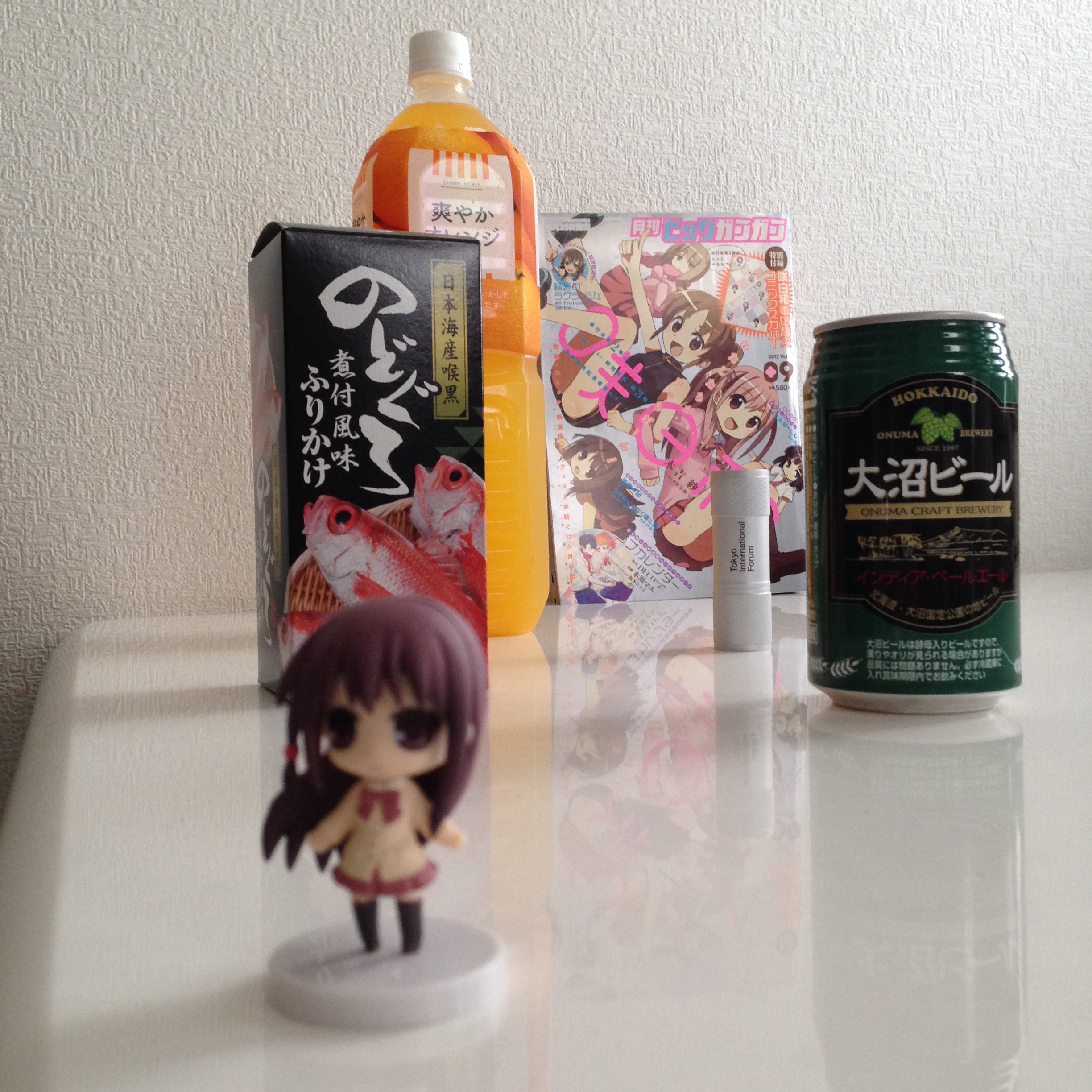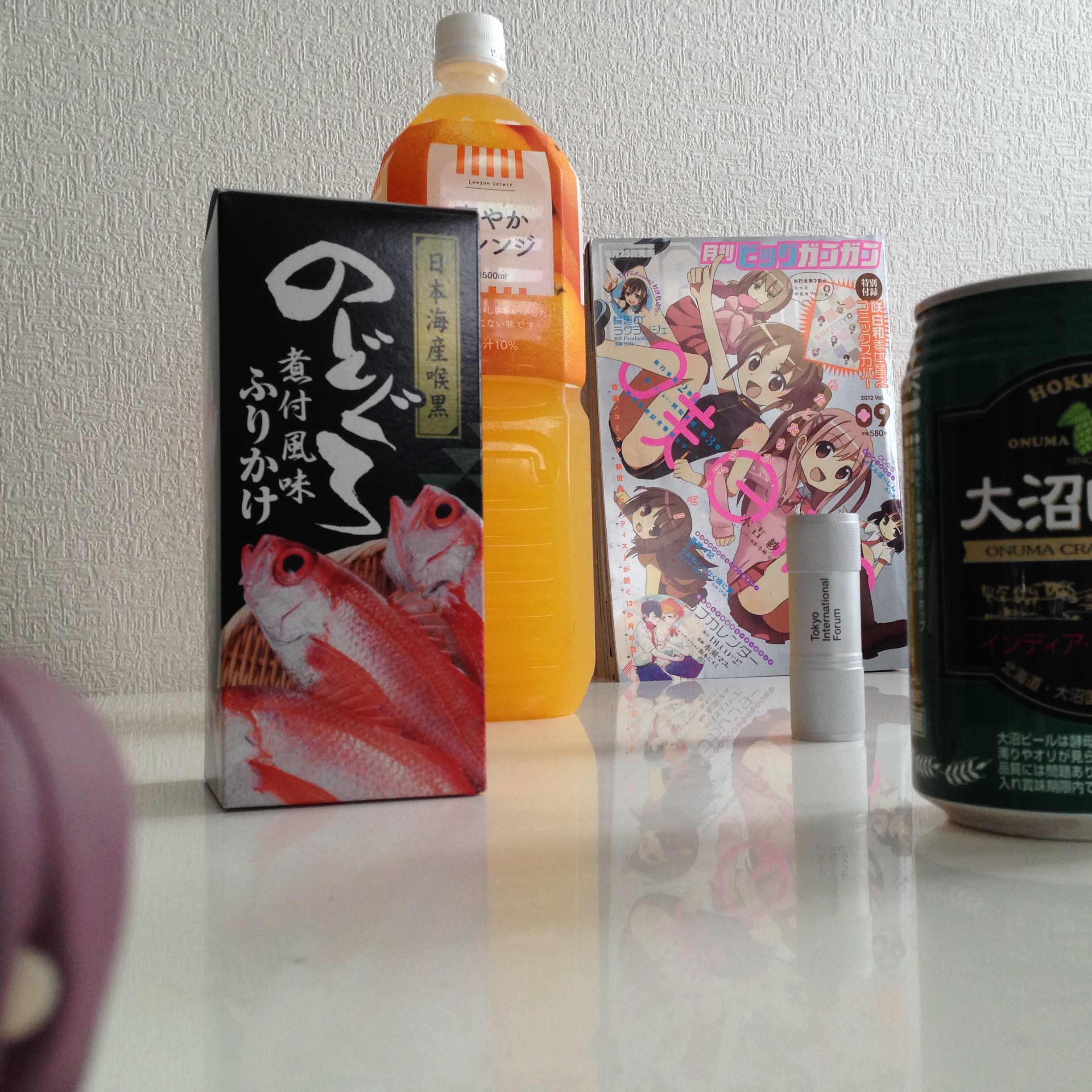 右は大沼ビール1/2個分、左はのどぐろふりかけ1個分、上は爽やかオレンジキャップ3個分、下は大沼ビール1個分…といった具合にしっかり全体構図を意識してからシャッターをば。