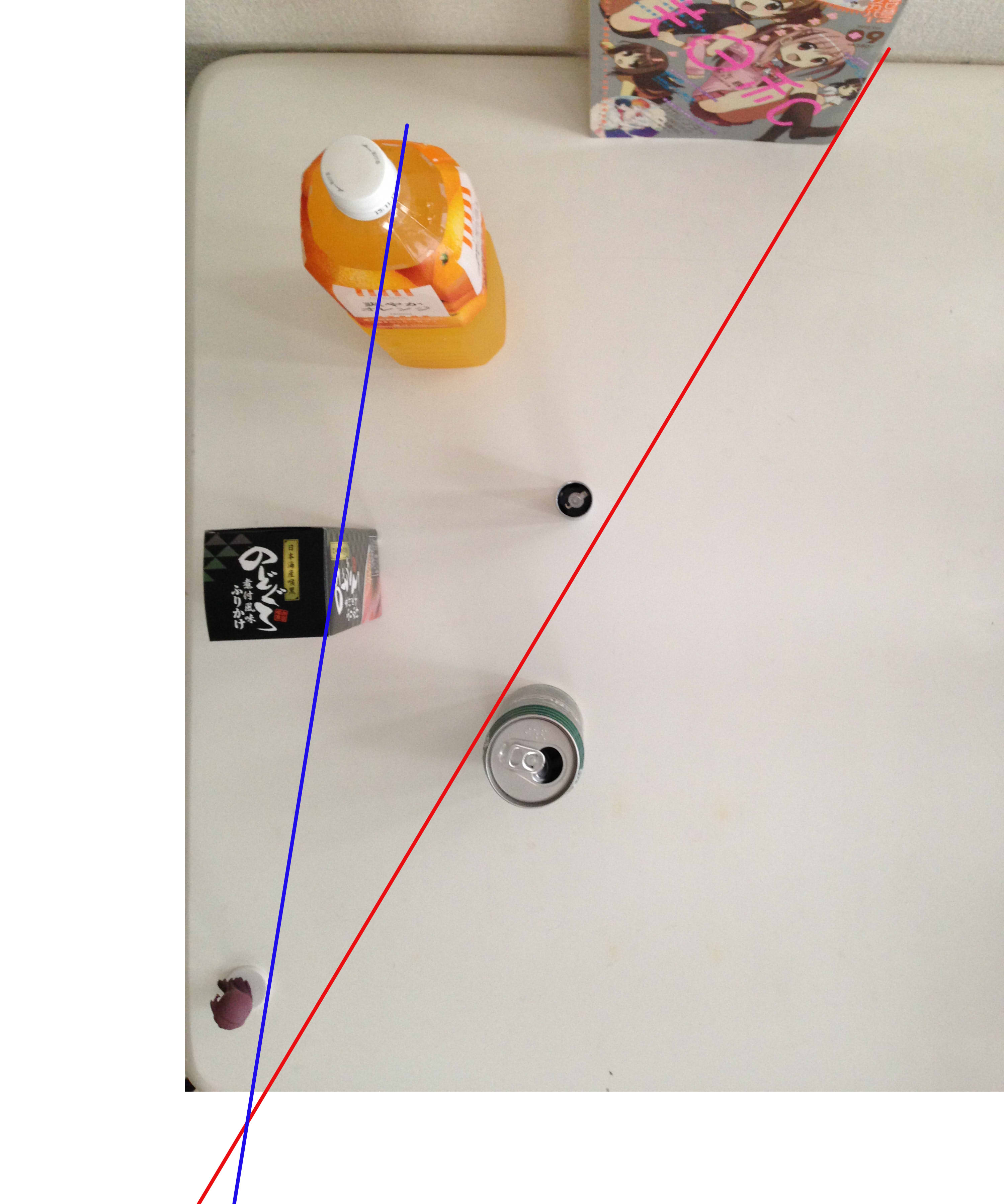 例1のライン(赤)を守りつつ、(爽やかオレンジキャップ右端 - のどぐろふりかけ右端)を見つければそこが例2のラインとの交差点₌立ち位置となります。