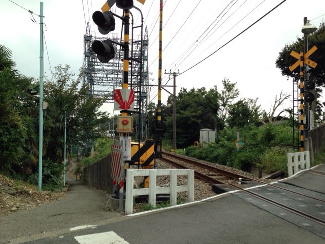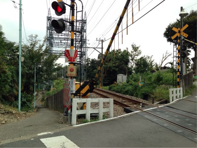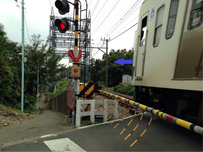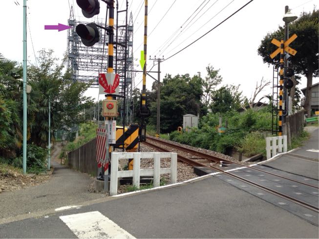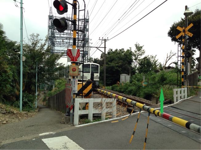 左上の信号と奥の鉄塔,遮断機と奥の鉄棒の掛かり具合なんかを見ると良いかと思います。